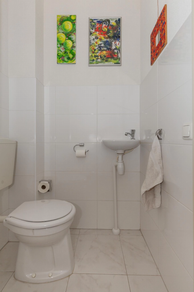Betegelde voortuin met haag. Entree, hal met witte plavuizen vloer en meterkast met 8 groepen en twee aardlekschakelaars. Gedeeltelijk betegelde toiletruimte met lichte betegeling, een staand closet en een fonteintje.