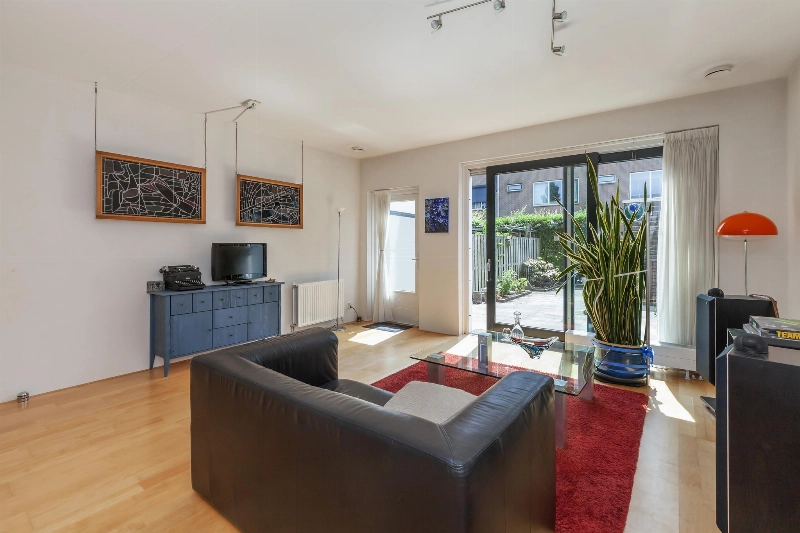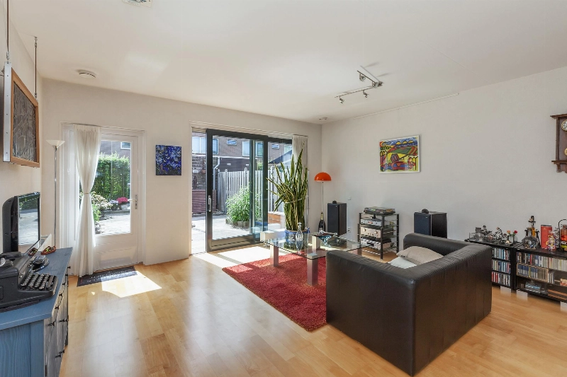 We lopen door naar de ruime, tuingerichte woonkamer. Deze is voorzien van spachtelputzwanden en een mooie lamelparketvloer. Er is een deur én een brede schuifpui naar de tuin, dit geeft een ruimtelijk effect op deze lichte woonkamer. Via de grote schuifpui bereikt u de betegelde (op het zuiden gelegen) tuin. In de tuin bevindt zich een houten berging met elektra en er is een doorgang naar de steeg.