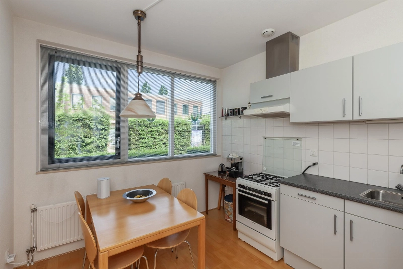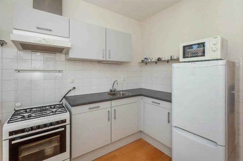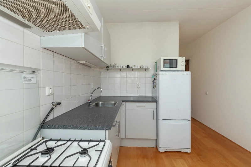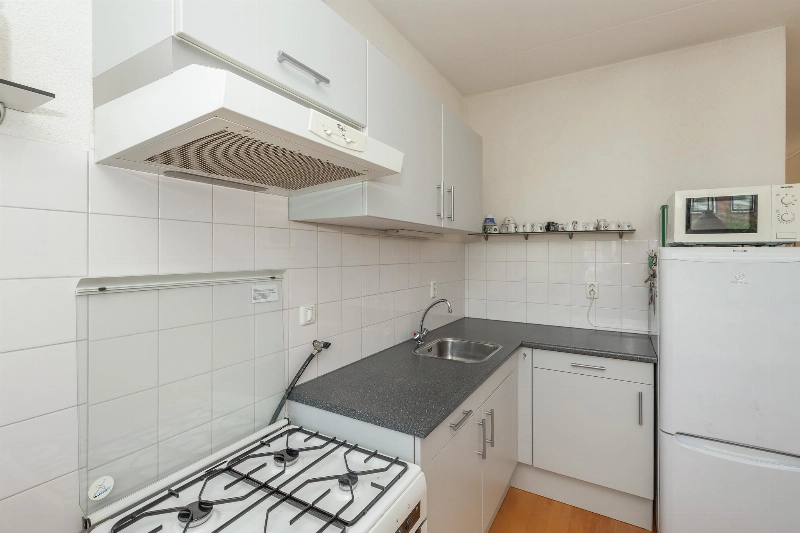Aan de voorzijde van de woning ligt de woonkeuken. Deze is uitgevoerd met een eenvoudige doch nette opstelling in lichtgrijs met afzuigkap en witte achterwandbetegeling. De losse keukenapparatuur gaat mee.