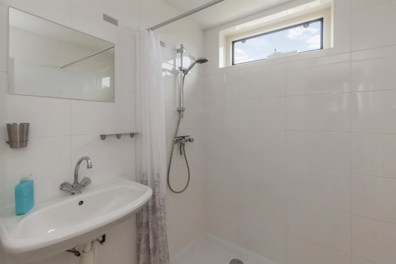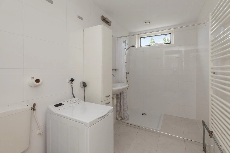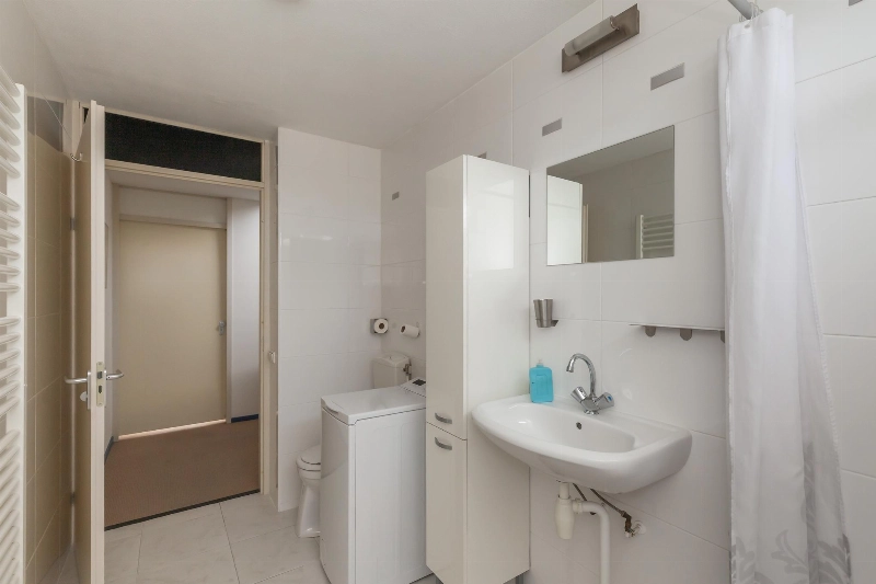 Er is verder een ruime badkamer. Deze is geheel wit betegeld en voorzien van een toilet, wastafel met kast, wasmachine-aansluiting, douchehoek en er is voldoende daglicht.