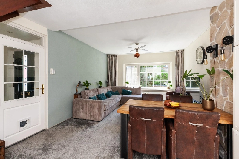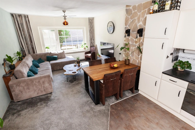 De woonkamer is een gezellige ruimte met spachtelputz wandafwerking en een energiezuinige convector radiator. Hierdoor kunt u het hele jaar door genieten van een comfortabele temperatuur.
