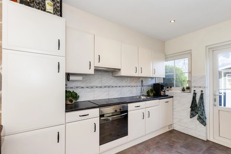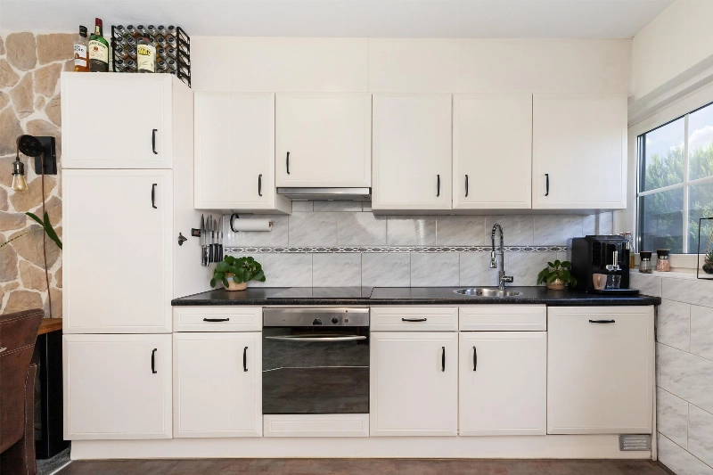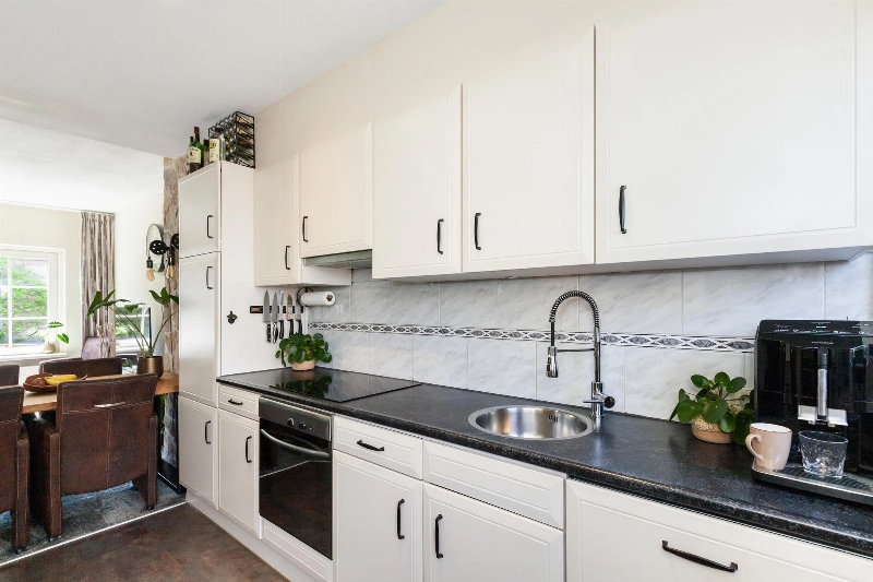 De open keuken heeft een lichte inrichting met een zwart aanrechtblad en beschikt over de volgende apparatuur; een inductie kookplaat (2020), een wasemkap, een koelkast, een oven en een vaatwasser (2020). Ook vanuit de keuken is de achtertuin te bereiken.