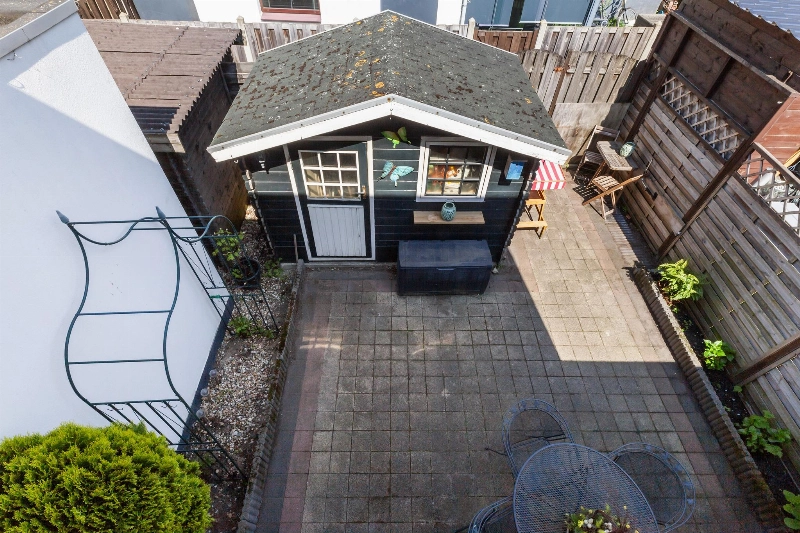 Vanuit de inpandige berging kom je direct in de tuin, die is bestraat en beschikt over een houten berging met elektra.