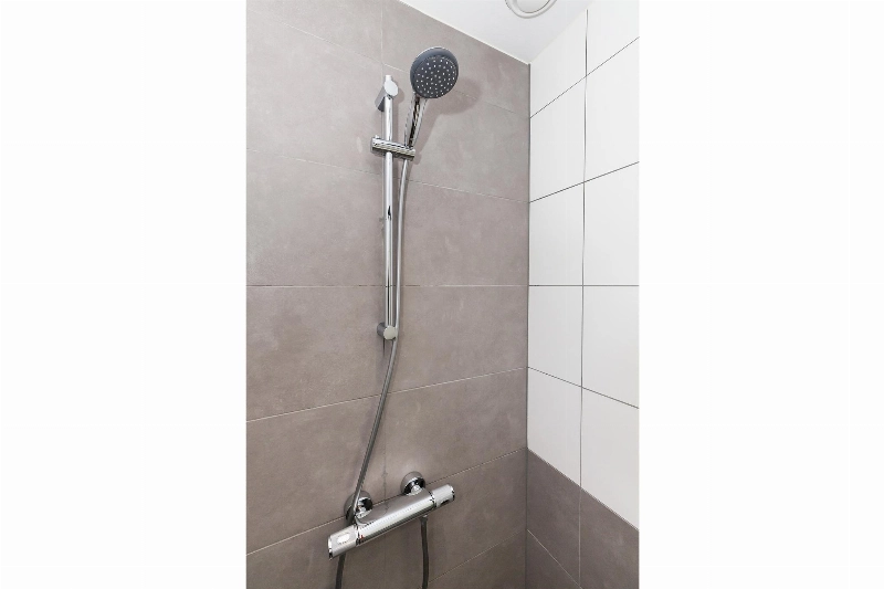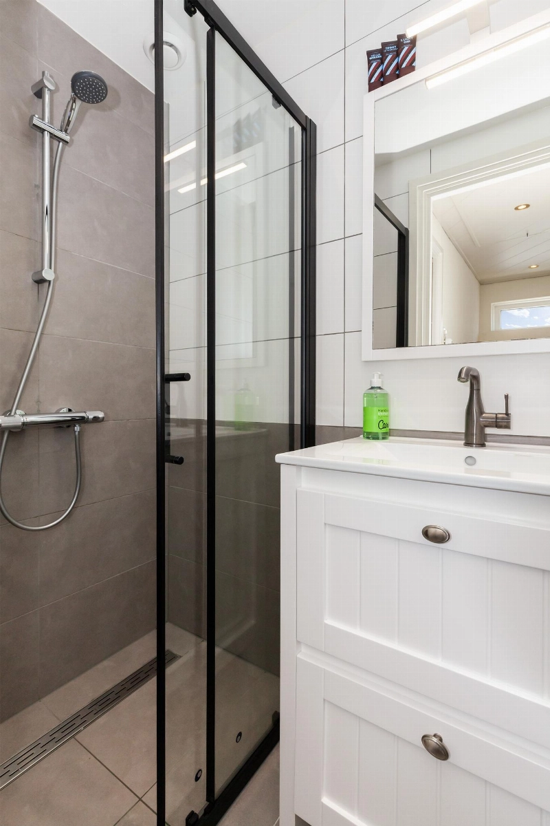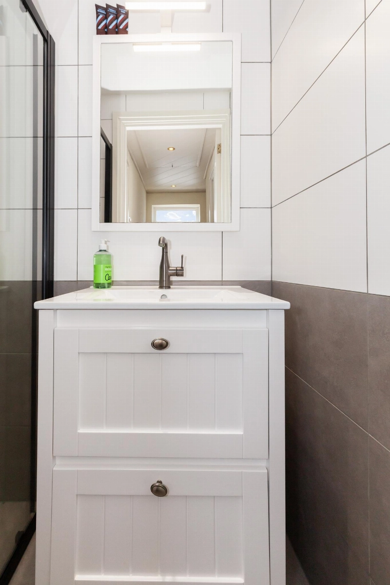 De gemoderniseerde badkamer heeft mooie grote grijze en witte wandtegels, grijze vloertegels, een douchehoek met een draingoot en glazen schuifwand en een modern wastafelmeubel met twee lades en een spiegel met verlichting. Het plafond is verlaagd en voorzien van inbouwspots en een afzuiging.