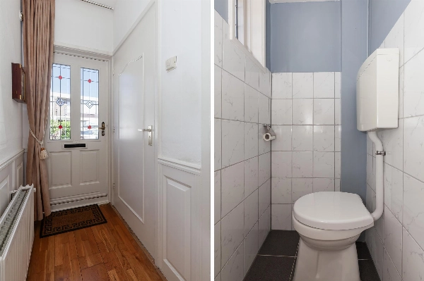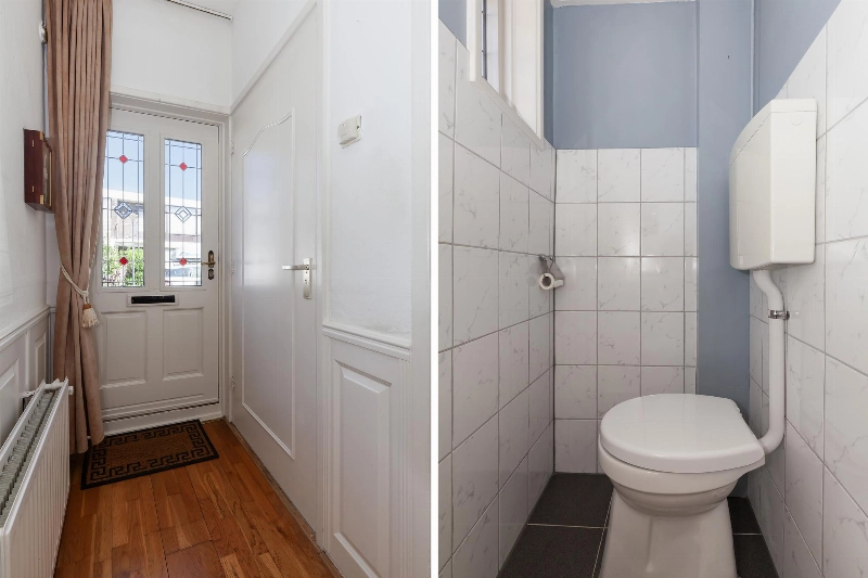 Entree, hal met een kast onder de trap en een keurige toiletruimte, voorzien van marmerlook tegels en een duoblok.