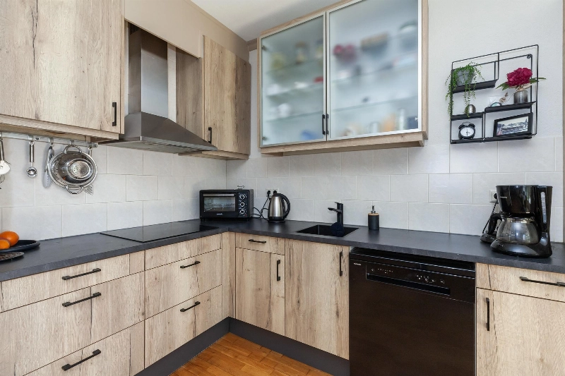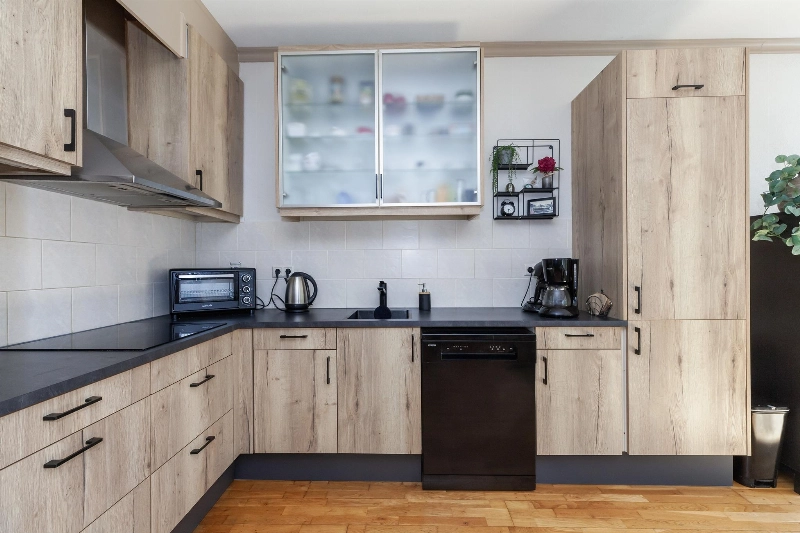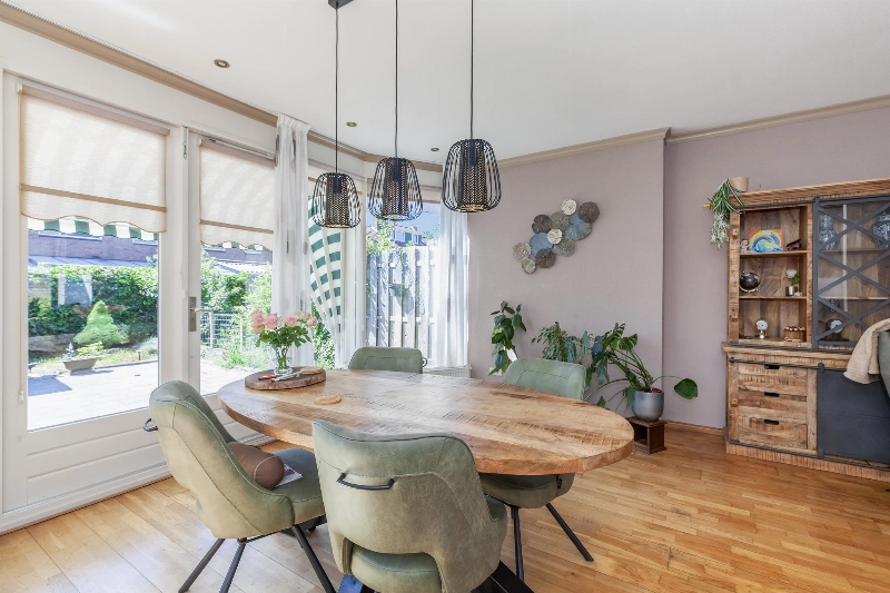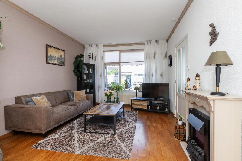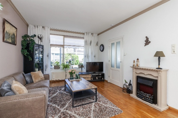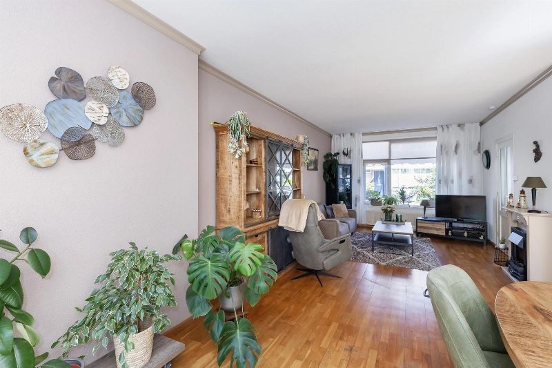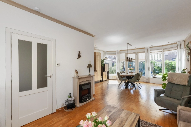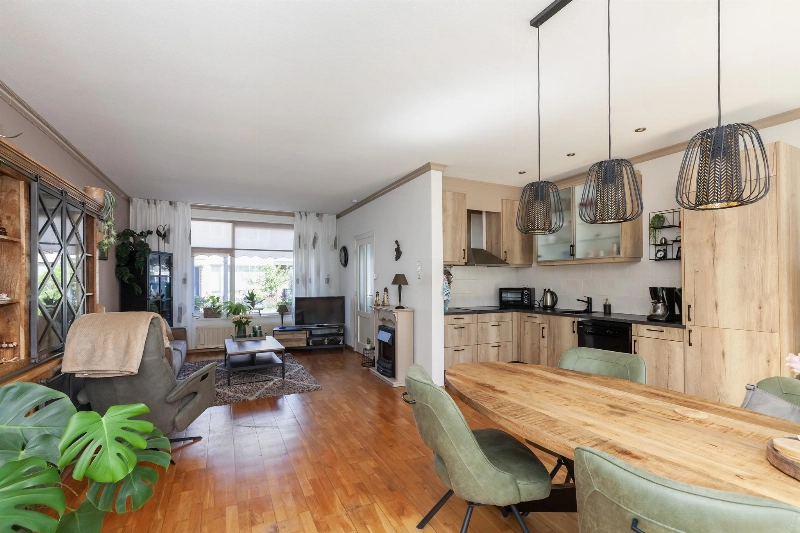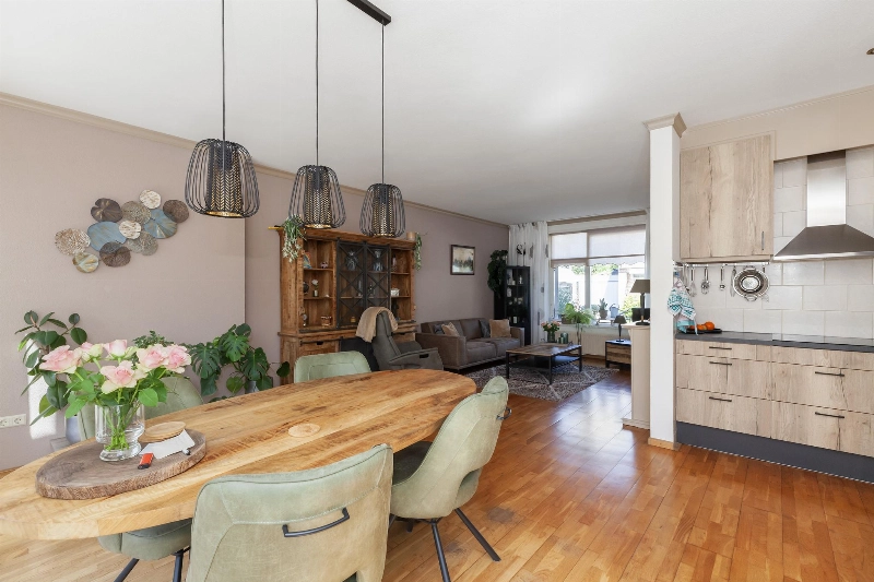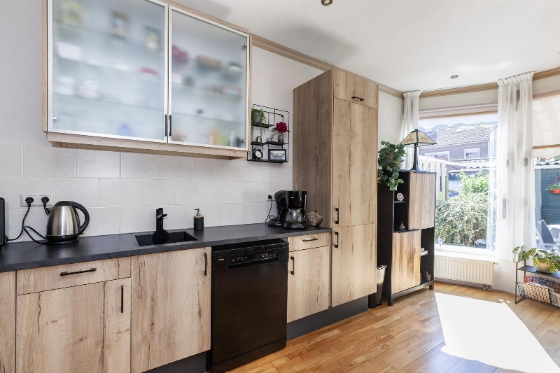 De ruime woonkamer is voorzien van een parketvloer en een gezellige zithoek aan de voorzijde. Aan de achterzijde bevindt zich een sfeervolle woonkeuken die dankzij de uitbouw een fijne, lichte ruimte is geworden. De keuken is in 2024 vernieuwd met een houtlook L-vormige opstelling welke is voorzien van een inductie kookplaat, een RVS afzuigkap, een koelkast, een vriezer, een vaatwasser en een zwarte spoelbak.
