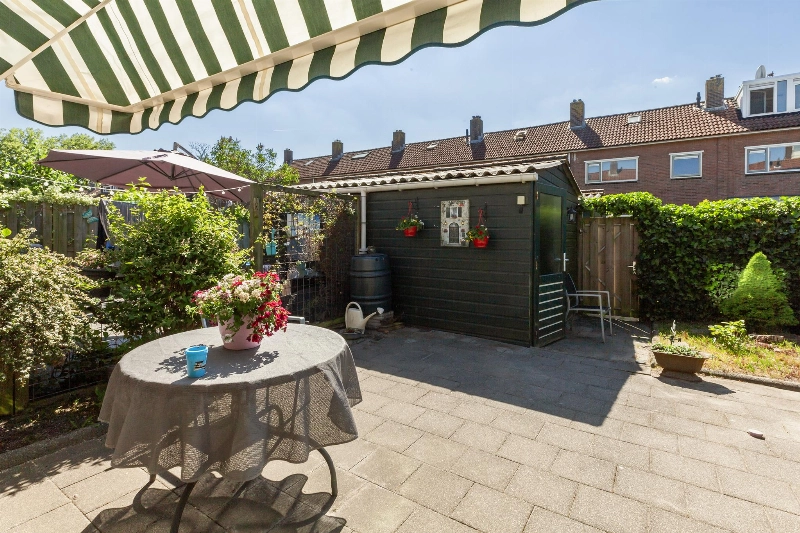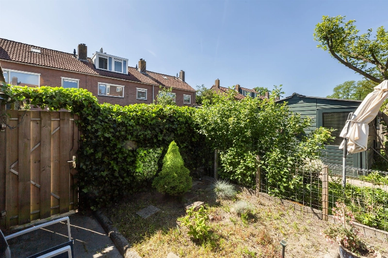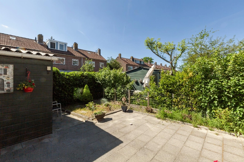 Dubbele deuren geven toegang tot de op het zonnige zuidwesten gelegen achtertuin. De achtertuin heeft bestrating en groen en beschikt over een houten berging. De poort biedt toegang tot het achterpad.