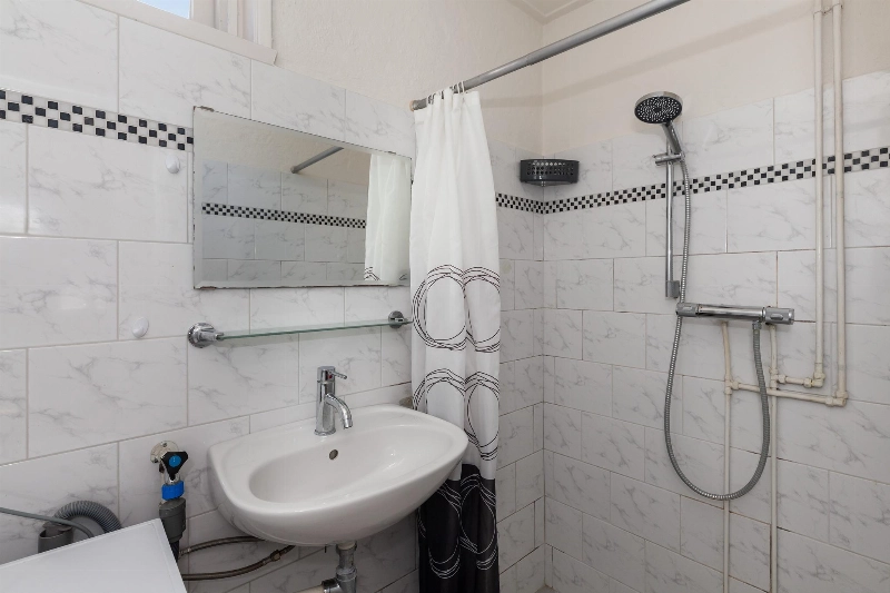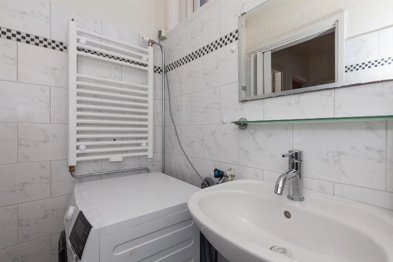 De badkamer is voorzien van gemarmerde tegels, een douchehoek, een wastafel en de aansluiting voor de wasmachine.