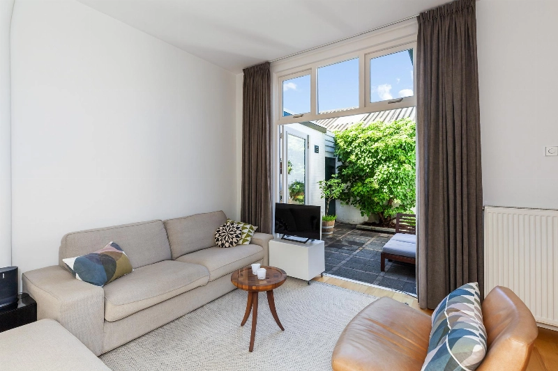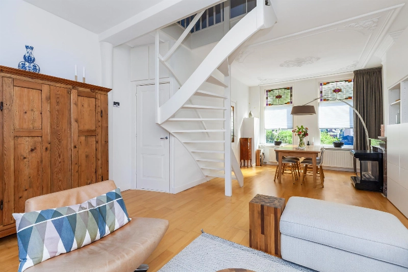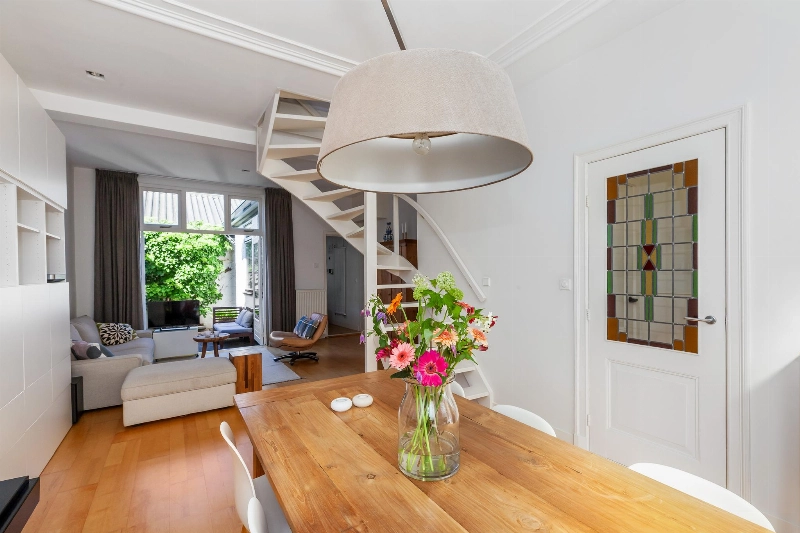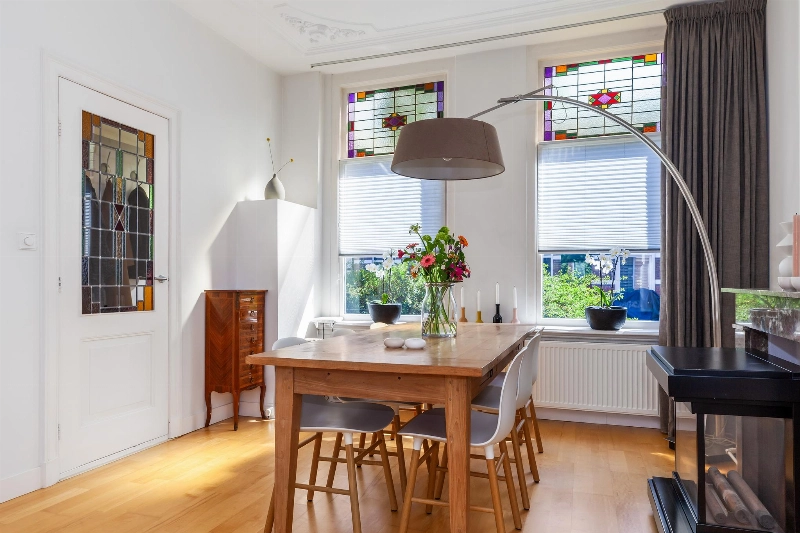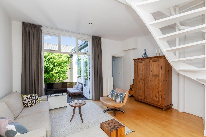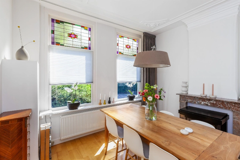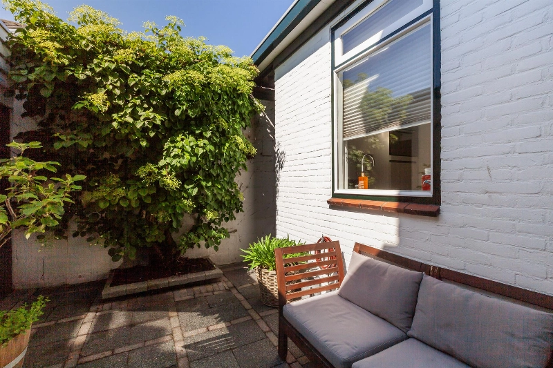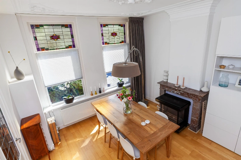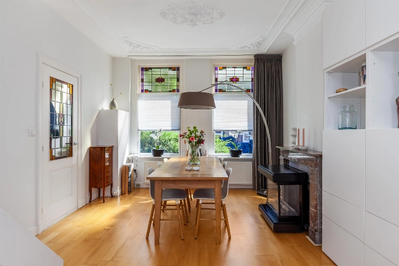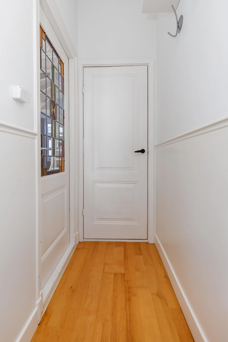 Entree aan de voorzijde van de woning naar de vestibule. Hier vindt de meterkast, garderobe en een gedeeltelijk betegelde toiletruimte met staand closet en fontein. De parketvloer in de hal loopt door naar de sfeervolle woonkamer. Wow.. het licht wat naar binnen danst door de glas-in-loodramen in combinatie met het ornamentenplafond maakt dat u zich hier meteen thuis zult voelen! De kamer heeft een goede afmeting en er is genoeg ruimte voor een eettafel en een gezellige zithoek aan de achterzijde. Hier vindt u tevens de nieuw geplaatste openslaande deur naar de tuin. De tuin is met recht een sfeervolle stadstuin te noemen en achterin staat een prachtig bloeiende klimop die groen brengt in de tuin. Er is een deur naar de steeg met achterom.