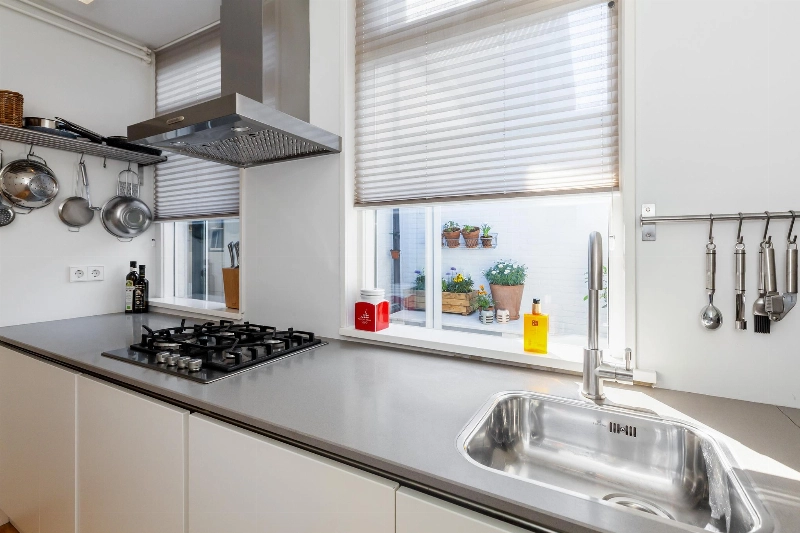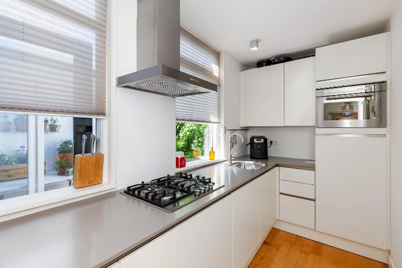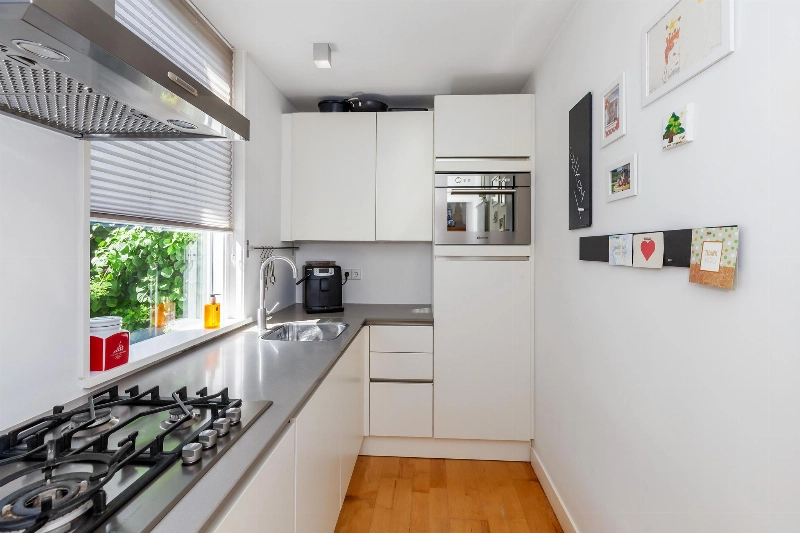 We gaan weer naar binnen en lopen via de woonkamer door naar de keuken. Deze geeft direct zicht op de tuin en is in 2012 nieuw geplaatst. Er is een magnolia witte hoekopstelling met een composiet aanrechtblad en voorzien van afzuigkap, 4 pits gaskookplaat, vaatwasser, vriezer, wasmachine-aansluiting, combimagnetron met stoomfunctie en een koelkast. De twee ramen in de keuken zijn vervangen.