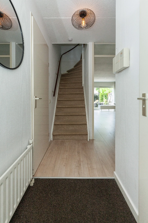 Binnenkomst in de hal met meterkast en modern afgewerkte toiletruimte, voorzien van houtlook tegels en witte wandtegels, zwevend toilet en fonteintje. Vanuit de hal is er toegang tot de garage, de woonkamer en er is een trap naar de eerste verdieping.