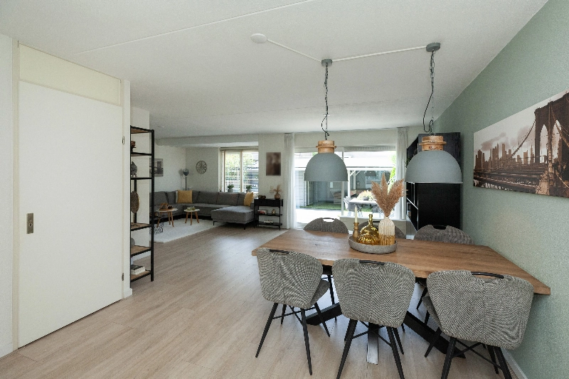 De open keuken aan de voorzijde biedt leuk zicht op de straat en het groen en is uitgerust met een grote hoekopstelling met moderne inbouwapparatuur zoals inductiekookplaat, afzuigkap, combi-oven, vaatwasser, koelkast en een vriezer. De keukenkastjes zijn in 2023 overgespoten en zien er helemaal strak uit.