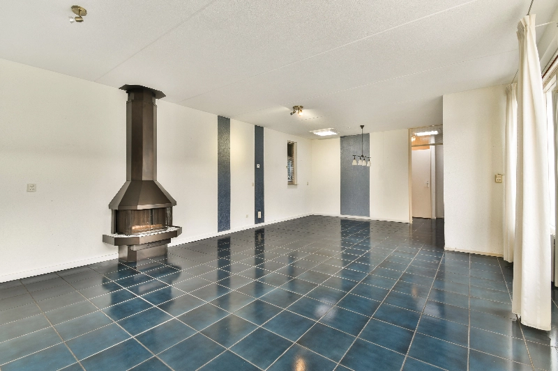 De ruime woonkamer met een afmeting van ca. 4.81 x 5.27/8.06m is voorzien een plavuizenvloer en spachtelputz wanden, door de grote raampartijen is er een mooie lichtinval en de sfeervolle hout gestookte open haard maakt de sfeer volledig af.