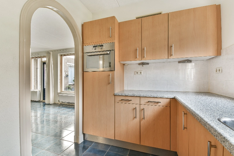 De semi-open keuken is voorzien van een plavuizen vloer en een U-vormig keukenblok voorzien van diverse inbouwapparatuur zoals koelkast, oven, inductiekookplaat, afzuigkap en vaatwasser.