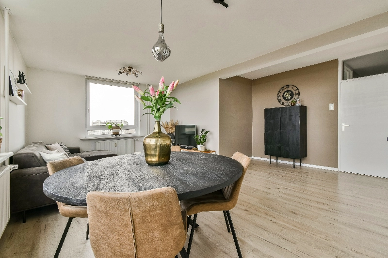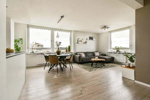 De royale en lichte woonkamer kenmerkt zich door de grote raampartijen, waardoor u continu geniet van een weids en dynamisch uitzicht. Alle wanden zijn gestuct en vanuit de woonkamer is er toegang tot een balkon.