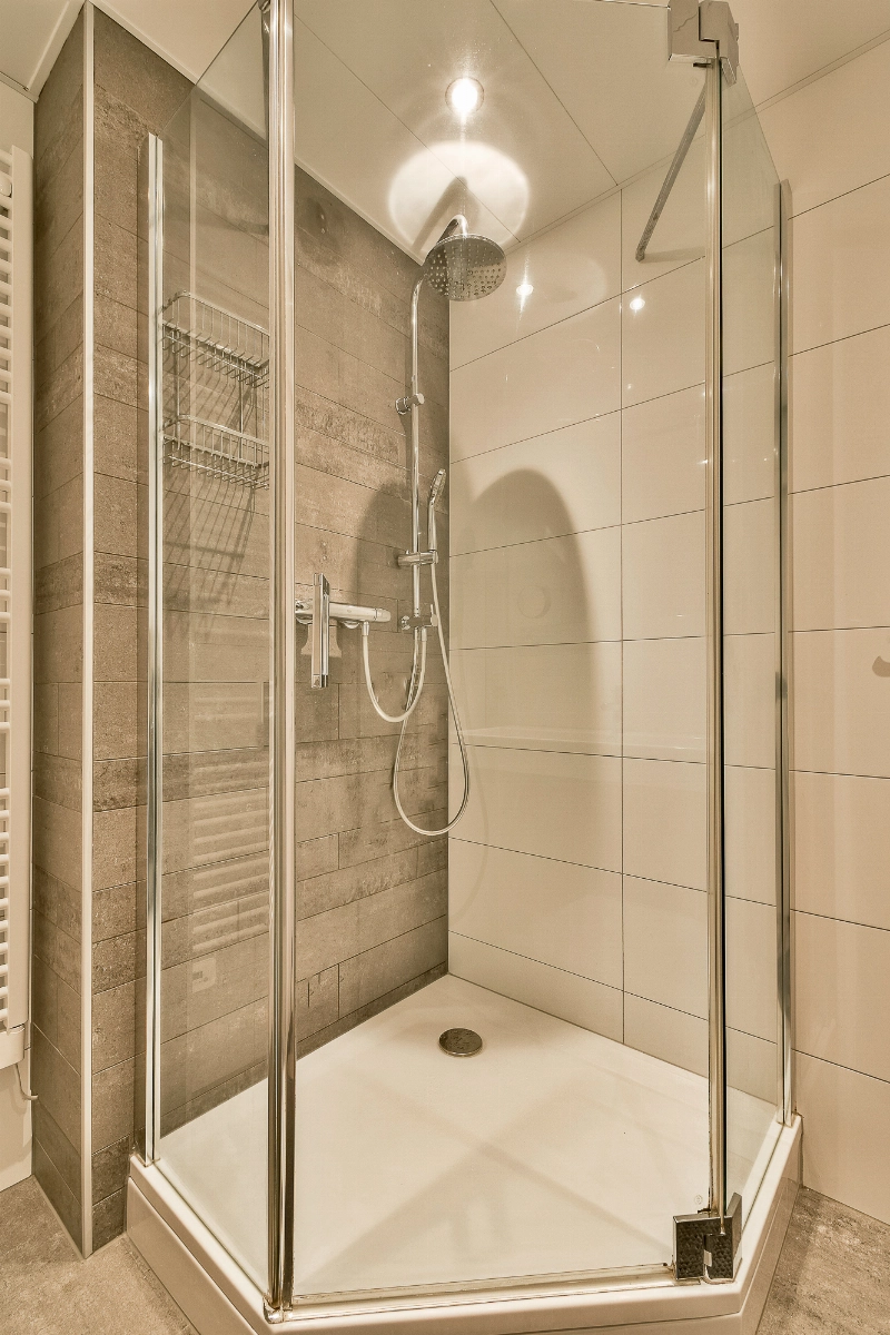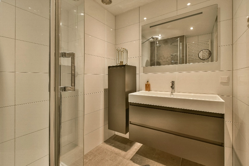 De moderne badkamer is verzorgd afgewerkt met witte en warmgrijze betegeling en voorzien van een douchecabine met een glazen douchewand met deur, een wastafelmeubel met lades, een spiegel met verlichting, een badkamerkast, een designradiator en sfeervolle spotverlichting in het plafond. Tevens is er mechanische ventilatie aanwezig.