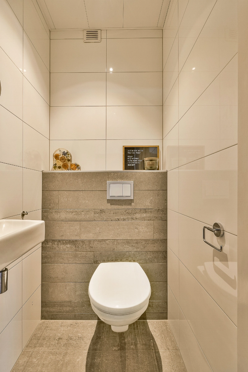 Het separate toilet is modern uitgevoerd met dezelfde betegeling als de badkamer en is voorzien van een zwevend closet en een fonteintje.