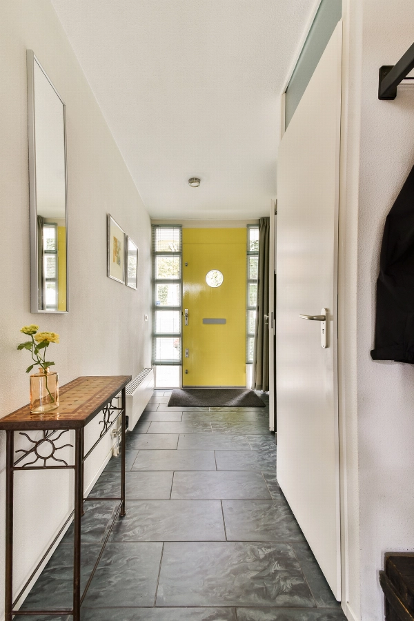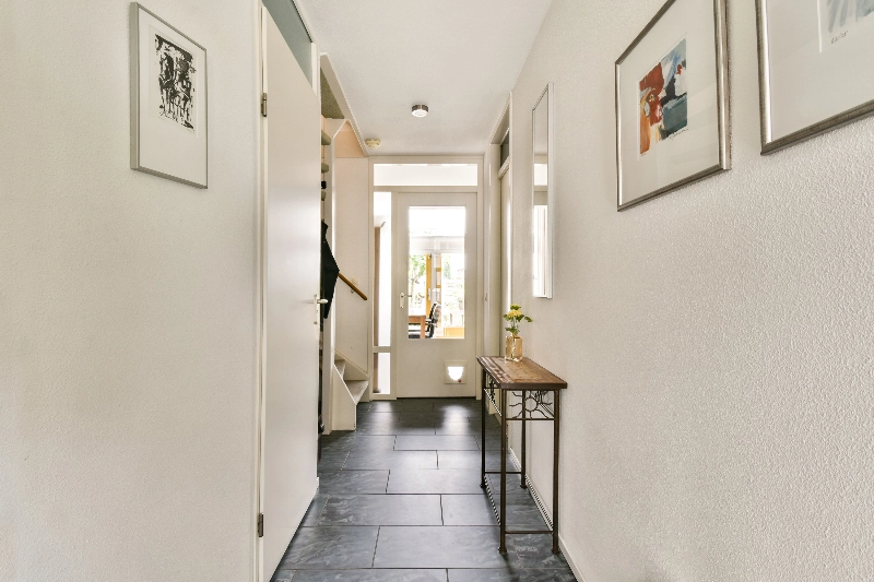 Entree, ruime hal met meterkast, vaste kast met wasmachine- en droger aansluiting en de omvormer voor de zonnepanelen.