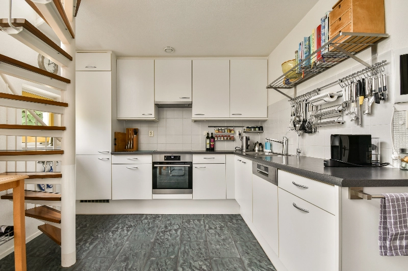 We gaan weer terug naar de gang en lopen door naar de ruime woonkeuken. Deze bevindt zich aan de achterzijde en is voorzien van een wit-essen hoekopstelling met vaatwasser, oven, inductiekookplaat, afzuigkap, koelkast en vriezer. In de keuken is een vide met een enorme raampartij naar de woonverdieping. Zo is er hier een fijne lichtinval en een leuke verbinding tussen keuken en woonkamer!