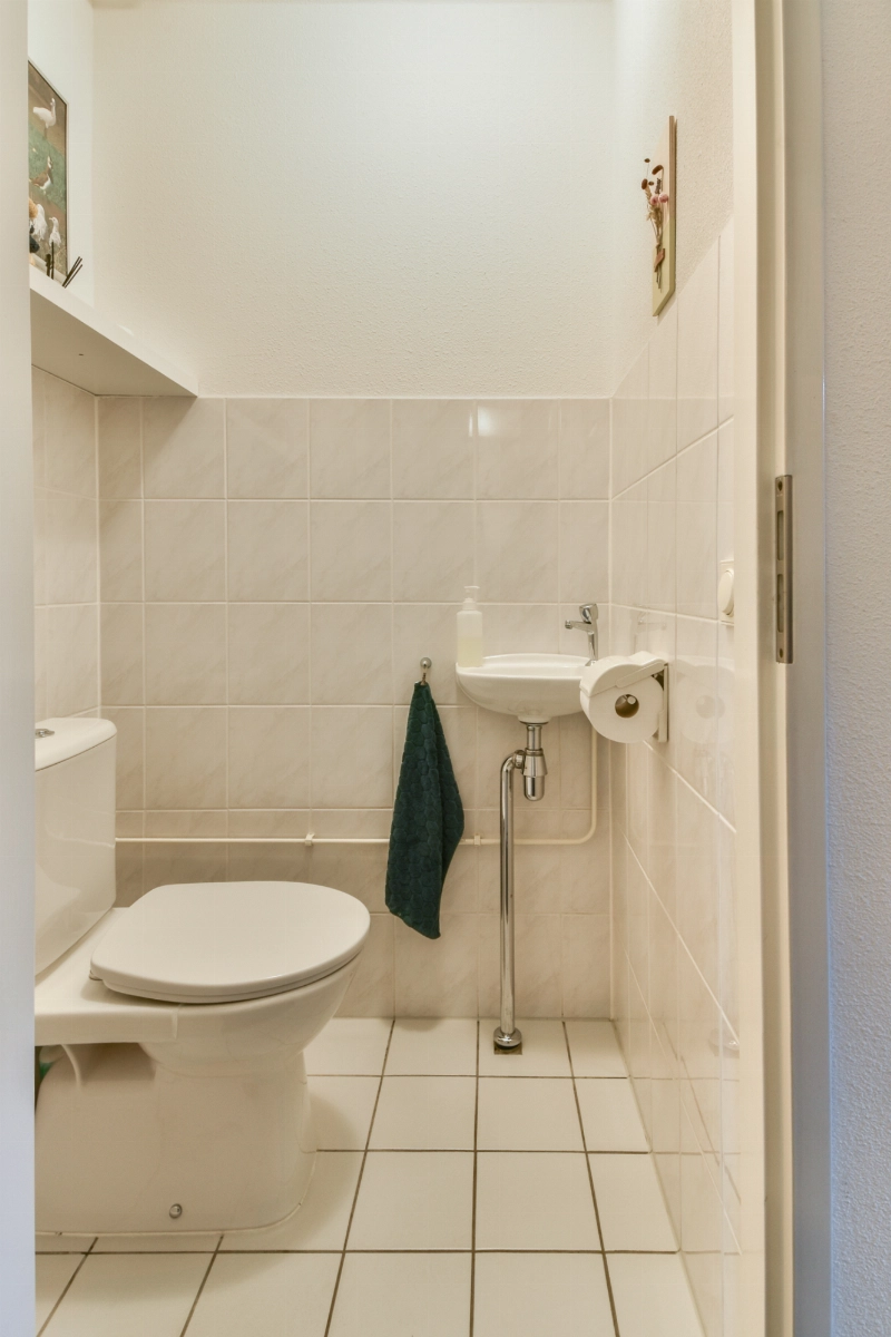Keurig, gedeeltelijk betegelde toiletruimte met staand closet en een fontein. Trapopgang naar de woonverdieping.