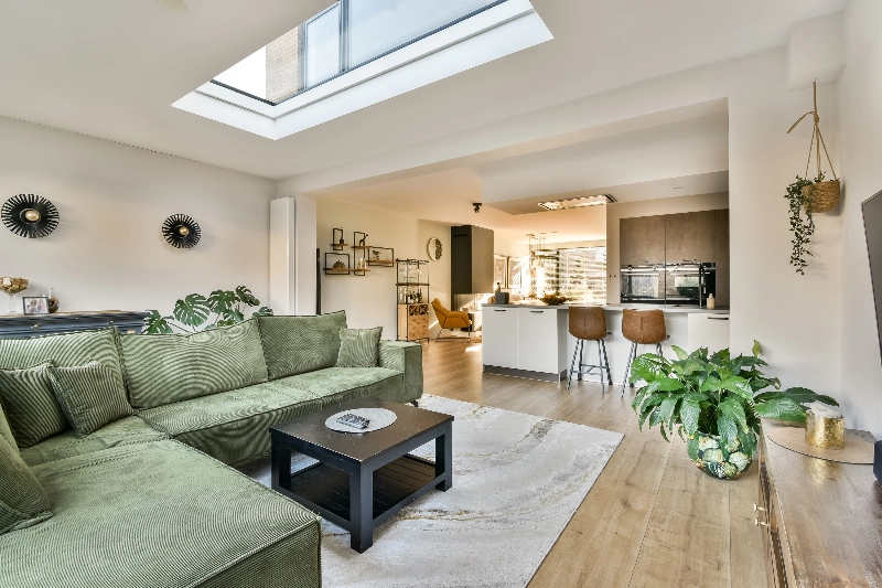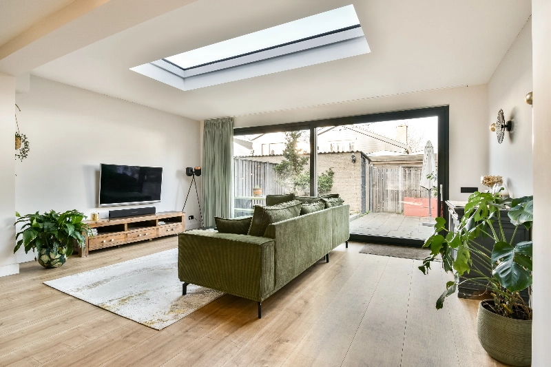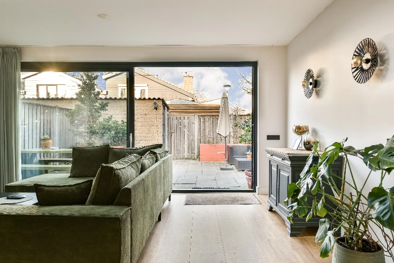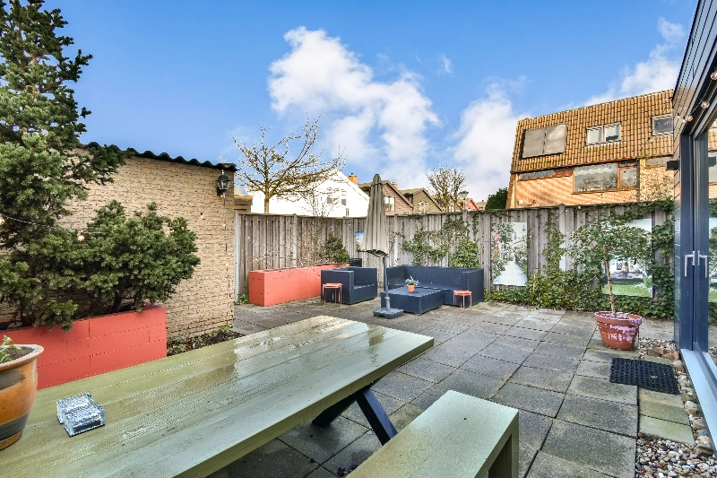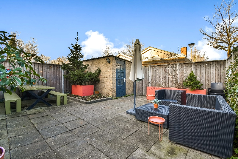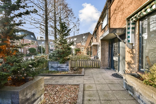 In de riante aanbouw met fraaie lichtstraat bevindt zich de zithoek. Dankzij de grote raampartijen en schuifpui wordt deze ruimte overspoeld met daglicht. Via de grote schuifpui bereikt u de keurig aangelegde achtertuin met bestrating, groene beplanting en een stenen berging.