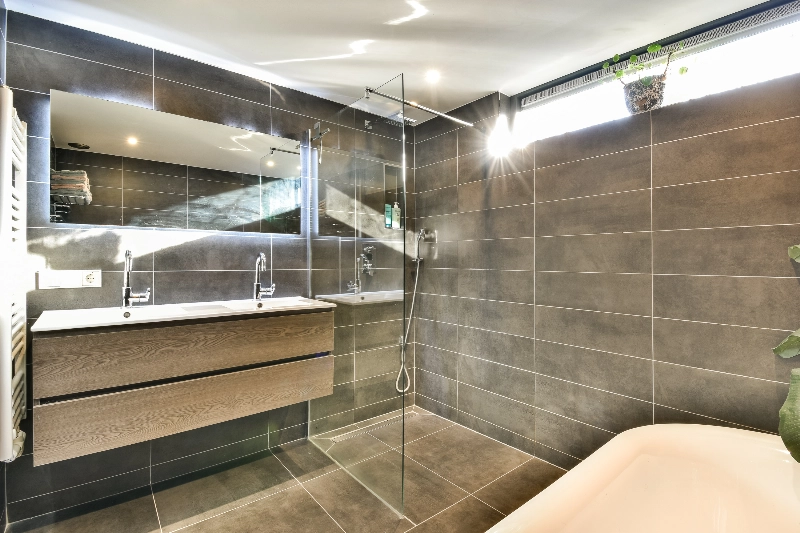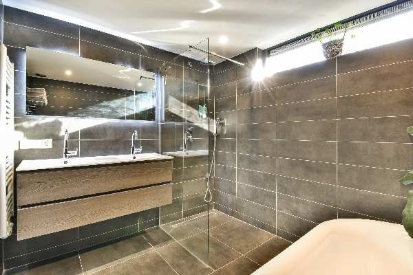 De moderne, vergrote badkamer is uitgevoerd met een vrijstaand ligbad, een ruime inloopdouche met een mooie glazen wand, een draingoot, een regendouche en een handdouche, een groot dubbel wastafelmeubel met lades en een spiegel met verlichting. In het plafond zijn spots verwerkt en er is een mechanische afzuiging.