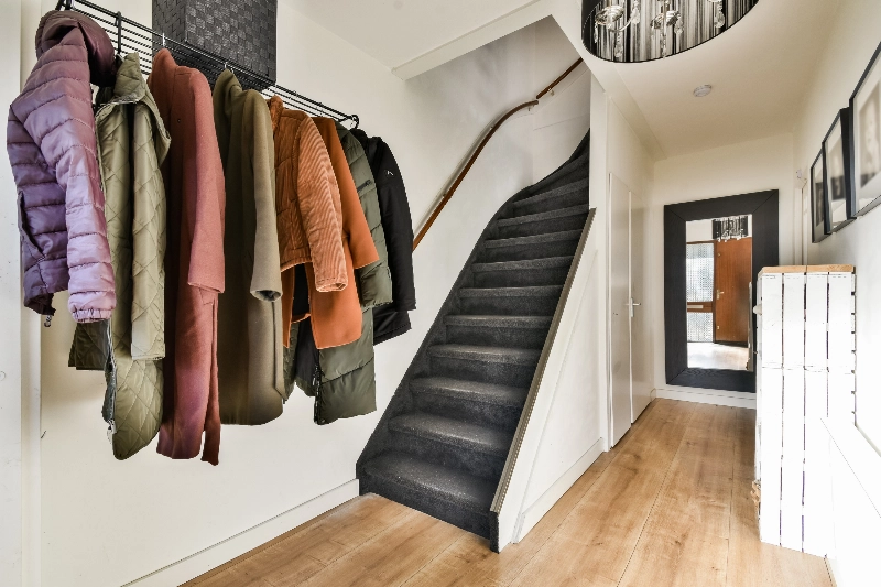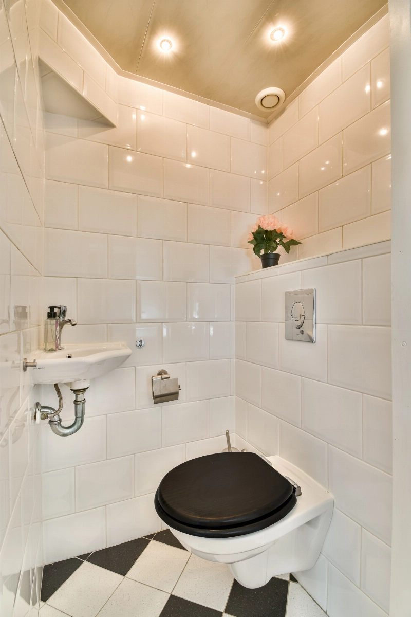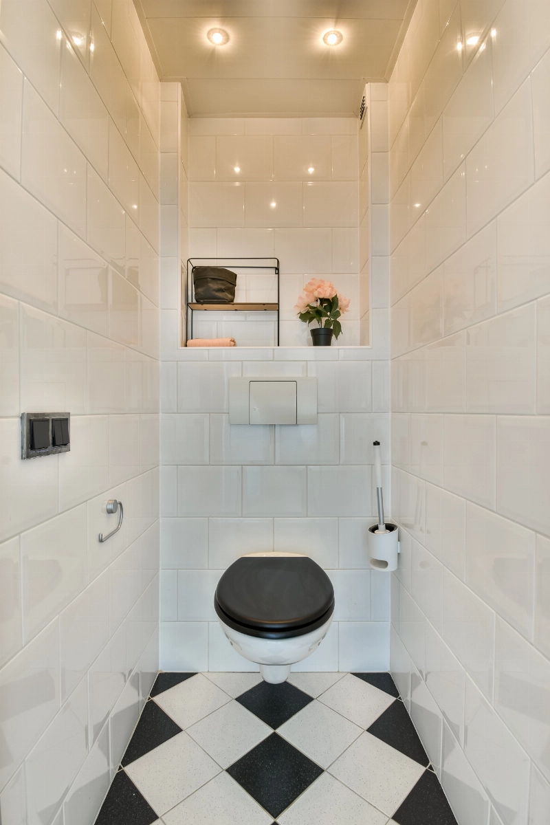 Entree, zeer ruime hal met meterkast, trapkast en een moderne toiletruimte met zwart/ witte betegeling, een zwevend toilet en een fonteintje.