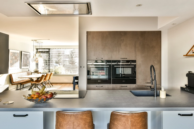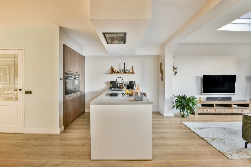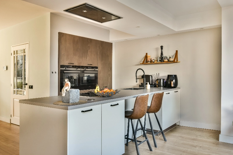 Centraal in de woning bevindt zich de moderne keuken (2018) met een groot eiland in de kleur gebroken wit met een betonlook aanrecht. De keuken is uitgerust met hoogwaardige inbouwapparatuur waaronder een inductiekookplaat, een plafondafzuiging, een vaatwasser en bijzonder veel opbergruimte. In de kastenwand met mooie industriële fronten bevinden zich een koel-/vriescombinatie, een combi-magnetron, een warmhoudlade en een heteluchtoven. Een droomkeuken voor iedere kookliefhebber!