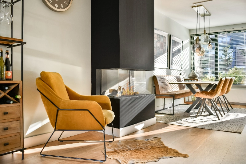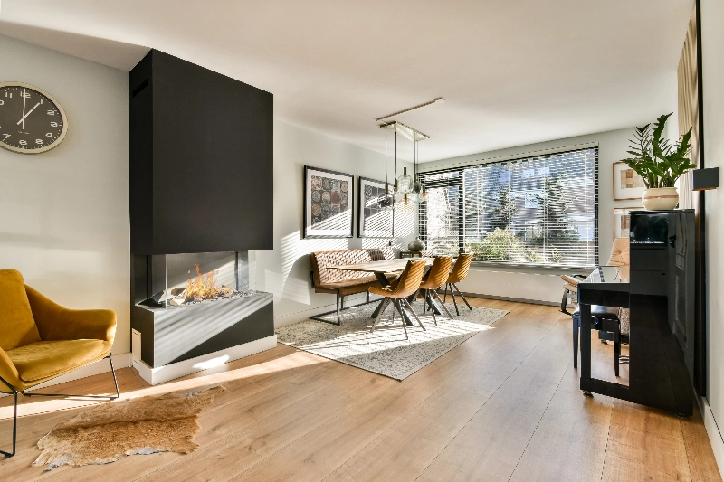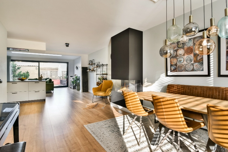 Via een stijlvolle deur met glasverdeling betreedt u de riante woonkamer. Aan de voorzijde is volop ruimte voor een grote eethoek, waar de gashaard zorgt voor extra sfeer en gezelligheid. Op de vloer ligt een brede planken houtlook laminaatvloer die naadloos doorloopt richting de keuken en zithoek.