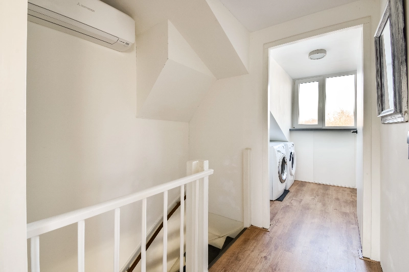 Ruime overloop. Aparte wasruimte met de aansluitingen voor de wasmachine en droger, de omvormer voor de zonnepanelen, de unit van de mechanische ventilatie en de opstelling van de c.v. combiketel (Intergas 2025)