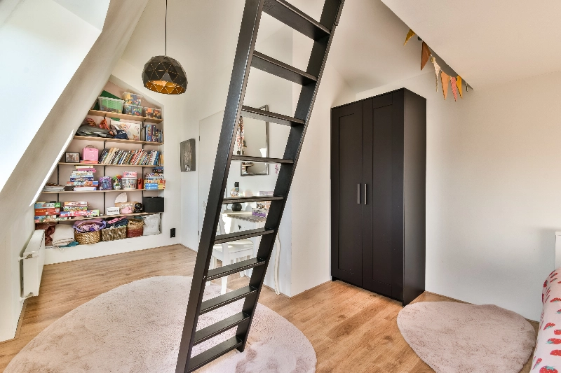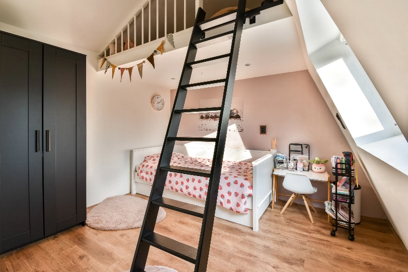 Slaapkamer IV is een speels ingedeelde kamer met een leuke speelruimte in de nok. Deze kamer is gelegen aan de voorzijde en voorzien van twee dakramen. De afm. is ca. 5.98 x 3.38 x 2.30m.