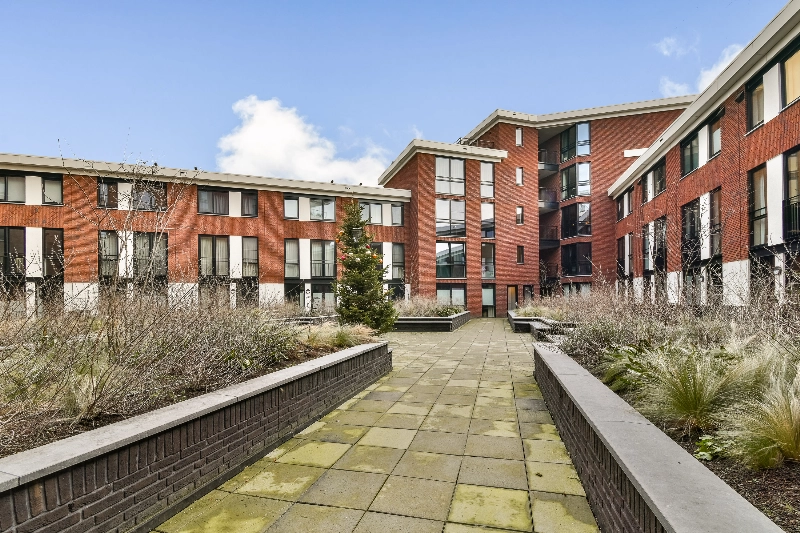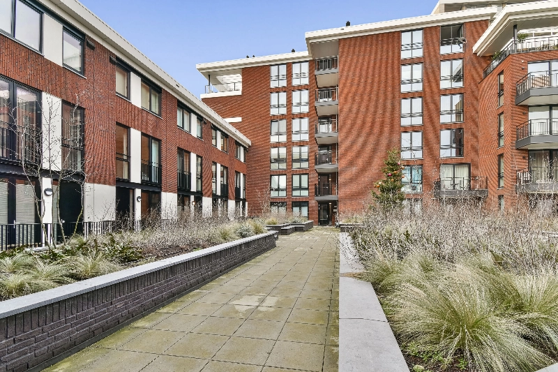 De gemeenschappelijke binnentuin is ruim van opzet en rijk beplant met groen en bomen, wat zorgt voor een rustige en aangename sfeer.