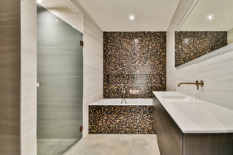 De separate badkamer is luxe uitgevoerd en voorzien van hoogwaardige betegeling, een wastafelmeubel met laden, een ligbad en een separate douchehoek met glazen douchescherm. De combinatie van moderne mozaïektegels en hoogwaardige kranen zorgt voor een verfijnde uitstraling.