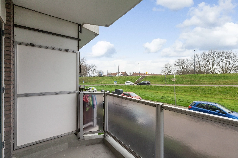 Aan de achterzijde ligt de lichte en ruime woonkamer met toegang tot het zonnige balkon op het zuiden. Hier geniet je vrijwel de hele dag van de zon én van het vrije, groene uitzicht.