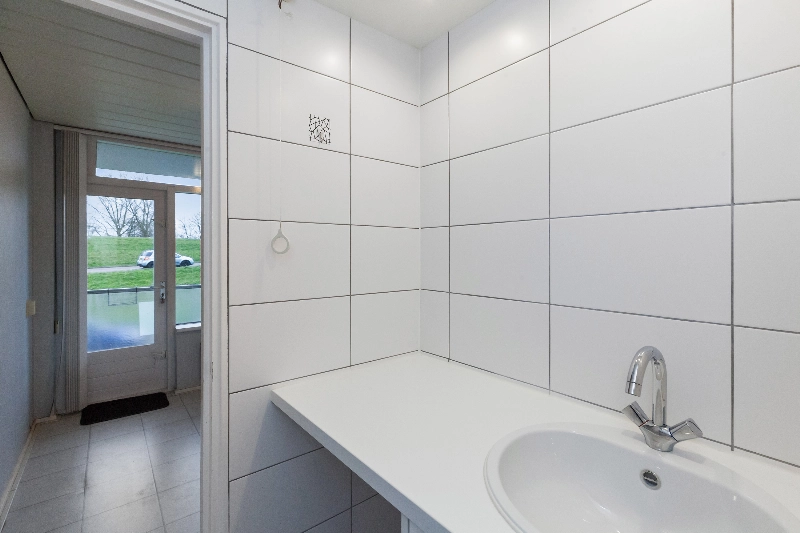 Het separate toilet bevindt zich in de hal en is volledig betegeld, voorzien van een staand closet en een fonteintje.