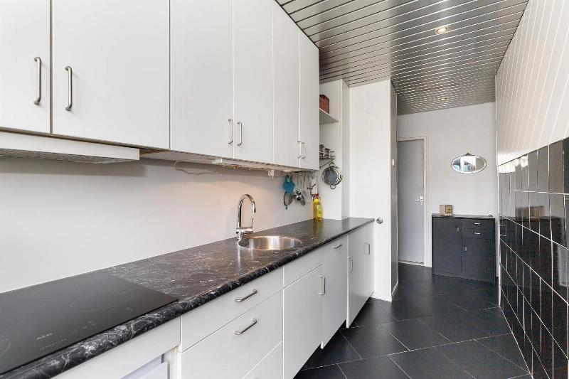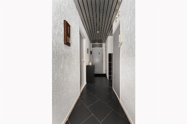 Entree op de 3e woonlaag. Ruime gang met plavuizenvloer welke doorloopt naar de keuken. Verder is er een meterkast, een gedeeltelijk betegeld toilet en een grote vaste kast met schuifdeur. De keuken ligt aan de voorzijde en is voorzien van een keurige witte opstelling met inductie kookplaat, afzuigvlakscherm en een oven. Tevens is er een toegang naar de doucheruimte. Deze is geheel betegeld en voorzien van een wastafel met spiegelkast en een douchehoek. Hier vindt je ook de aansluiting voor de wasmachine en de CV.