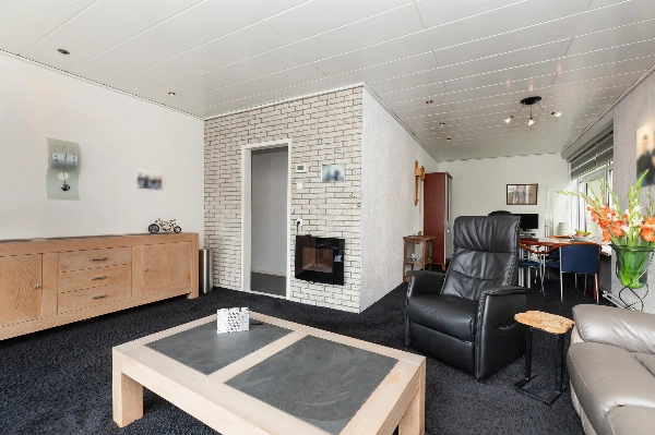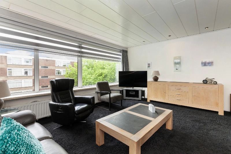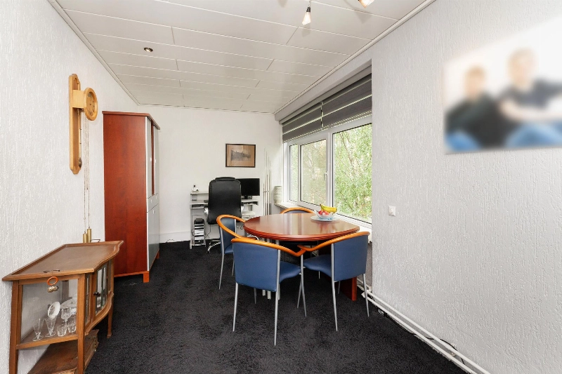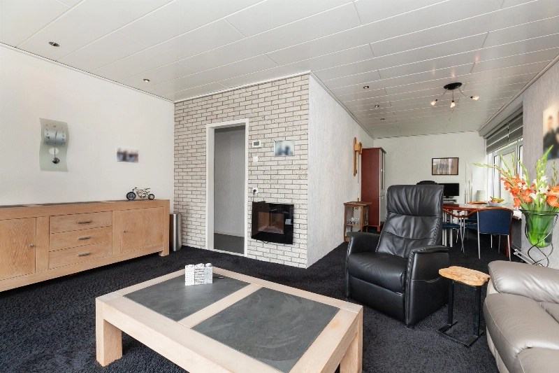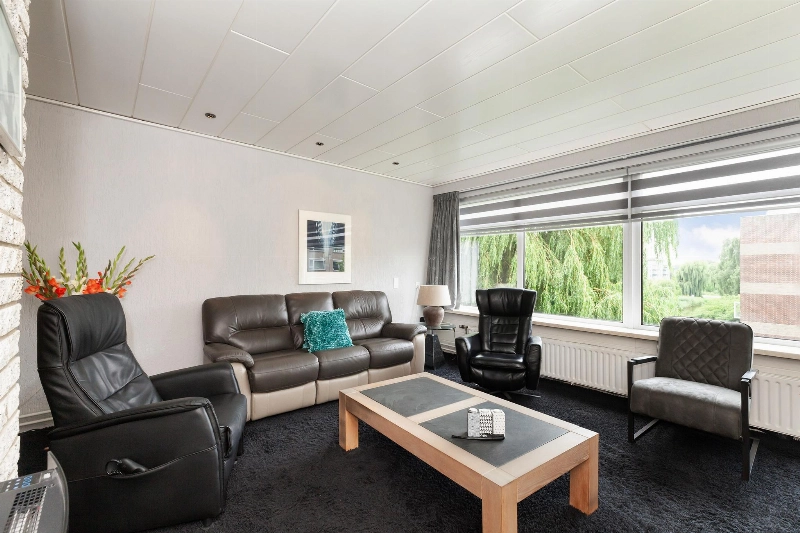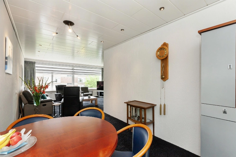 De ruime woonkamer is een fijne en lichte ruimte voorzien van kunststof plafonddelen en een speelse zijkamer (voorheen slaapkamer 4) met raam. Vanuit deze kamer heb je een vrij zicht op de wijk en het groen.