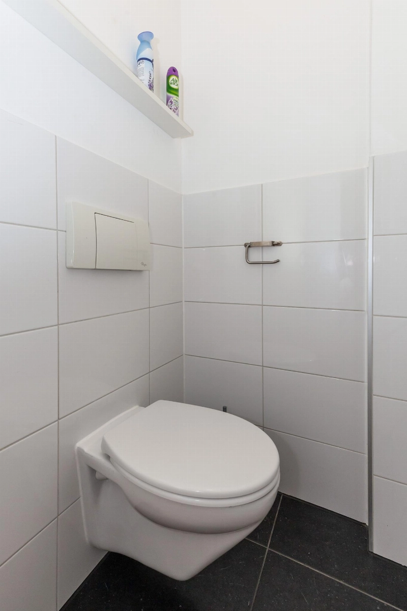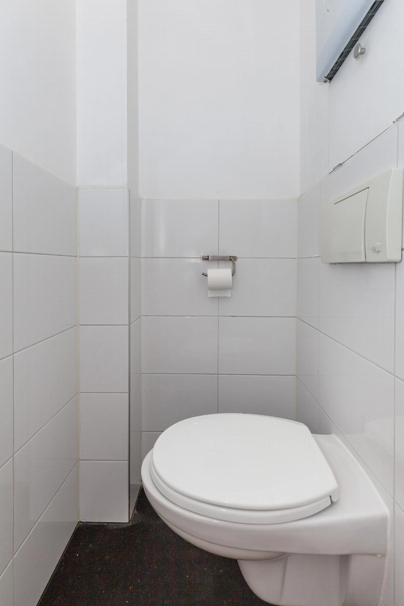 Separaat 2e toilet met gedeeltelijke witte wandbetegeling. Opstelplaats voor de CV-combi.
