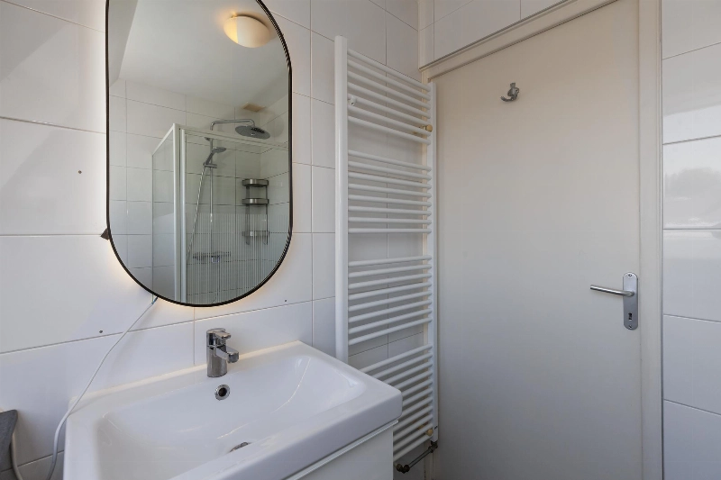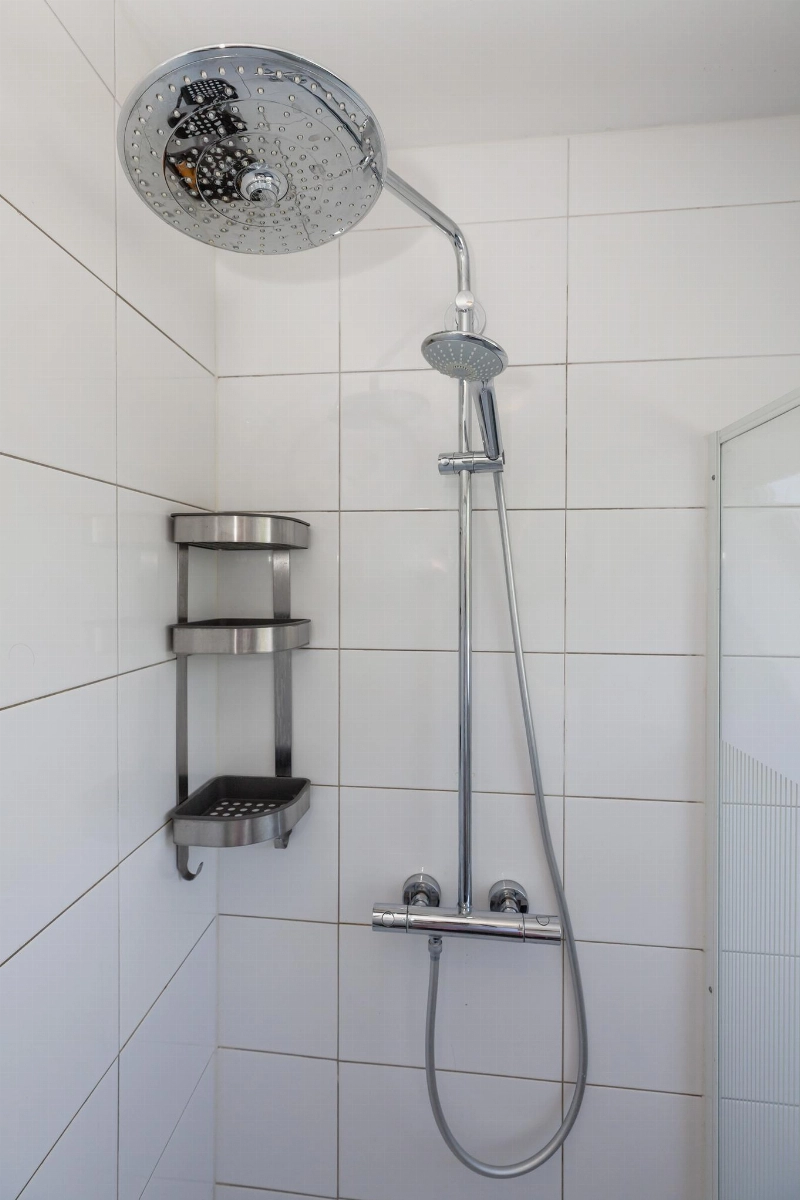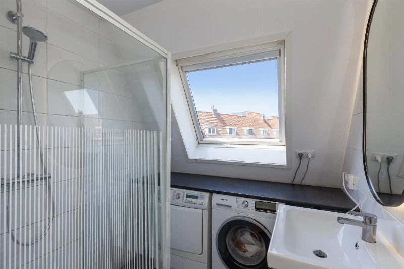De badkamer is modern betegeld met witte wandtegels en een PVC tegel vloerafwerking en is afgewerkt met een douchehoek, wastafel en een werkblad met daaronder opstelplaats voor de wasmachine en de droger. Een groot Velux dakraam zorgt voor veel licht.