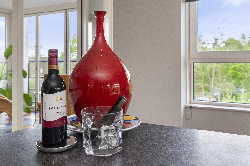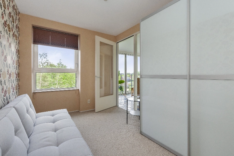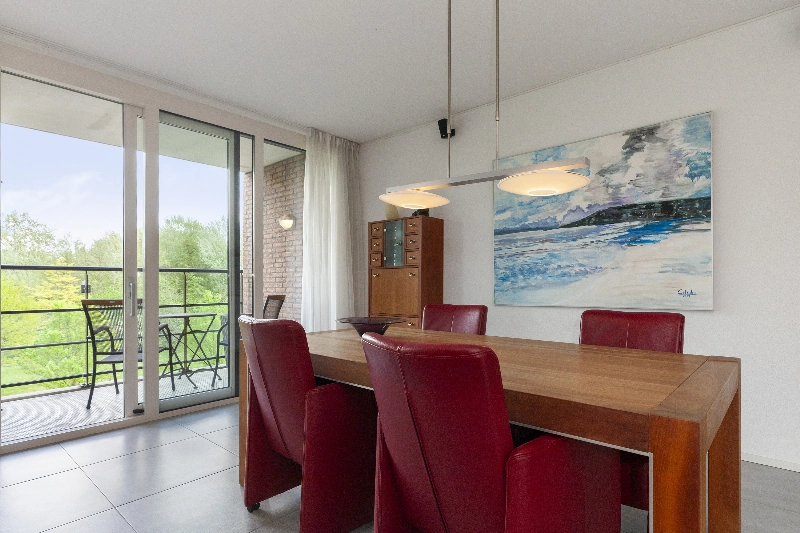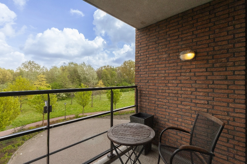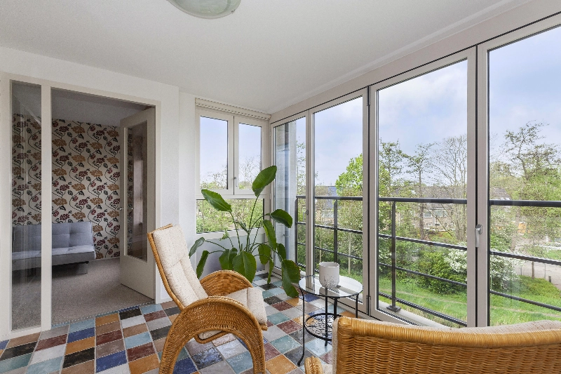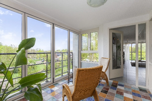 Vanuit de woonkamer is er middels een schuifpui toegang tot het overdekte balkon met vrij zicht over het groen en aan de andere kant van de kamer loopt u zo de zonnige serrekamer in. De grote harmonicadeuren kunt u helemaal openschuiven, dit is écht een heerlijke plek om van het zonnetje en het vrije uitzicht te genieten. Deze serre is voorzien van sfeervolle vloerbetegeling.