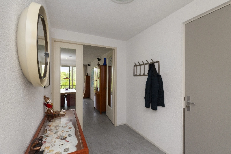 Bij binnenkomst valt direct de fijne lichtinval op. De grote raampartijen geven tevens een mooi uitzicht over het groen. In de ruime hal bevindt zich de videofooninstallatie, de meterkast en een volledig betegeld toilet met een zwevend toilet en een fonteintje.