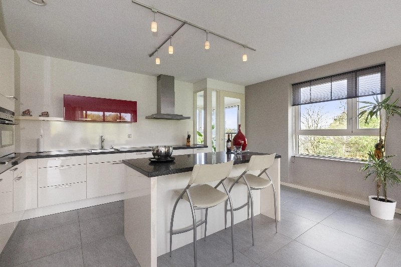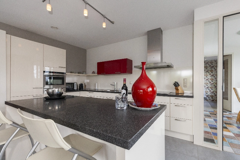 Een tussendeur met glas brengt u in de heerlijke ruime woonkamer met de mooie lichte hoogglans hoekkeuken met een zwart hardstenen aanrechtblad en een werkeiland met eetbar. De keuken is voorzien van een inductiekookplaat, een RVS afzuigkap, een combi-oven, een koelkast, een vriezer en een vaatwasser.