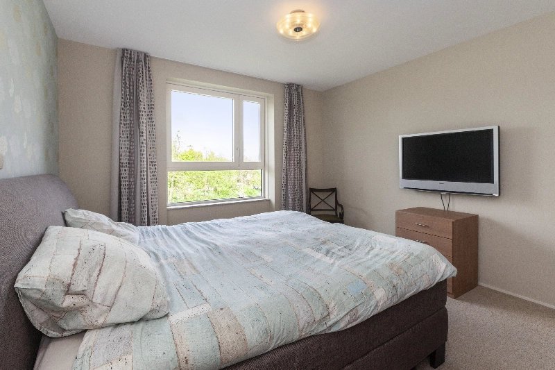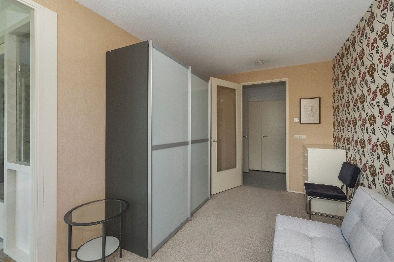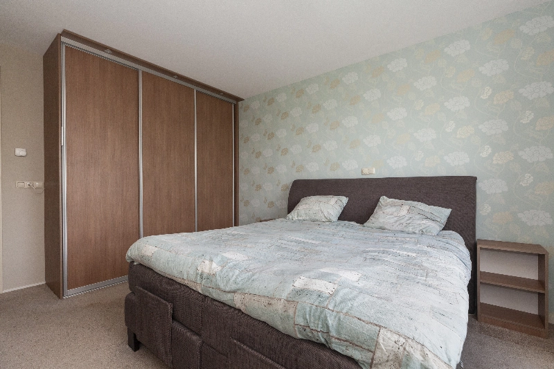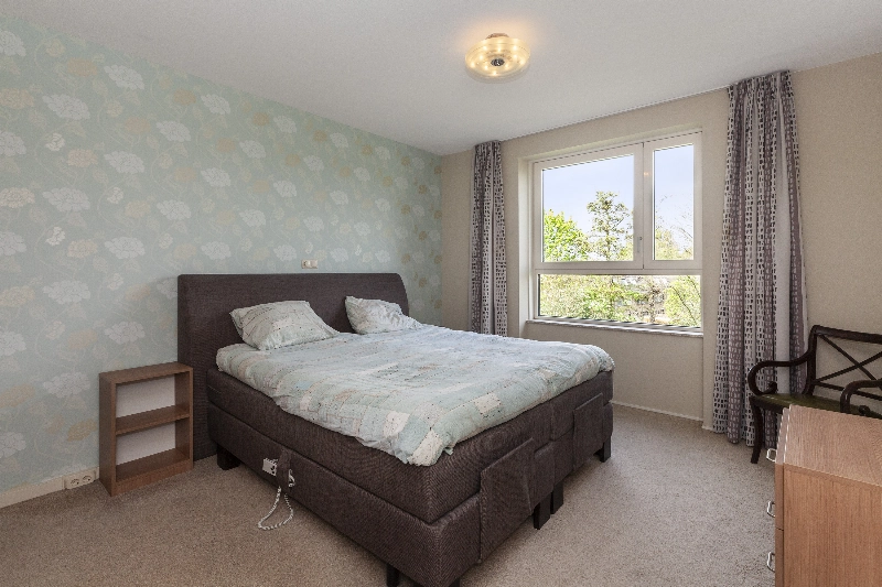 Slaapkamer II ( 4.70 x 2.71m) is eveneens te bereiken vanuit de serre en is voorzien van een voerbedekking en een schuifkastenwand. Vanuit deze kamer heeft u ook weer een vrij uitzicht.