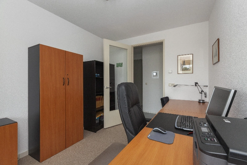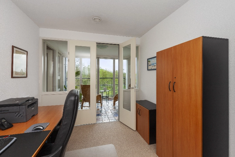 De slaapkamer/werkkamer sluit direct aan op de serrekamer, maar is ook via de hal te bereiken. Deze kamer heeft een afmeting van ca. 3.85 x 2.80m en heeft twee openslaande deuren.