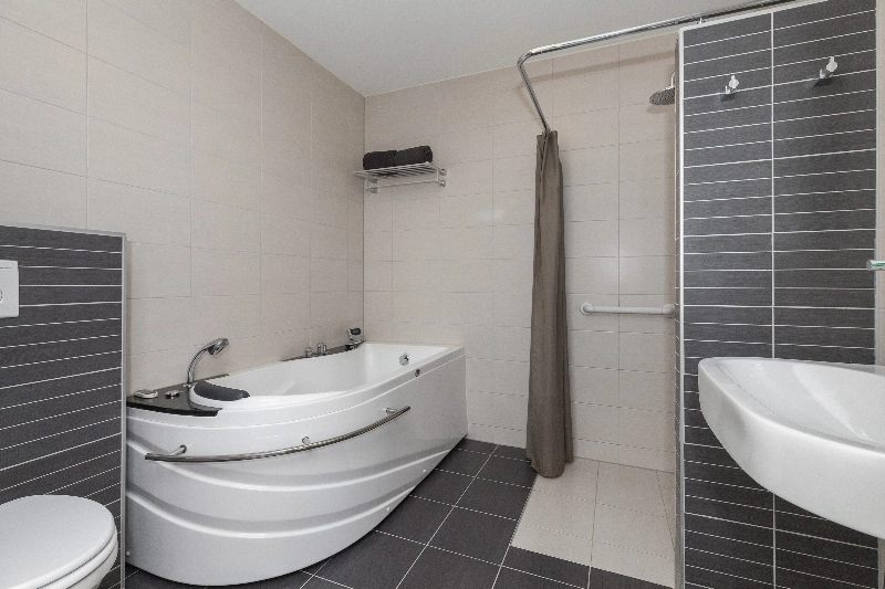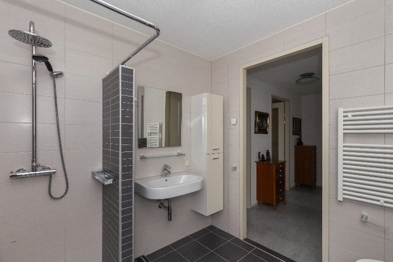 De moderne badkamer heeft mooie crèmekleurige wand- en antracietkleur vloertegels en is luxe uitgevoerd met een ruime inloopdouche, een jacuzzi, een wastafel met een zwevende kast en een 2e toilet.