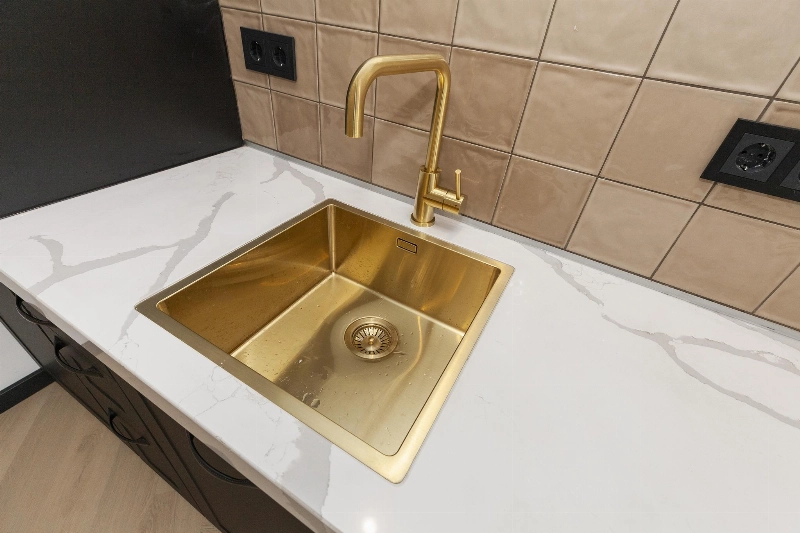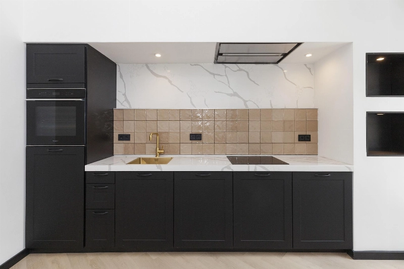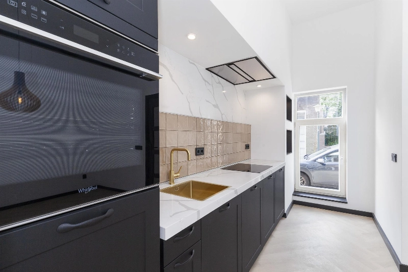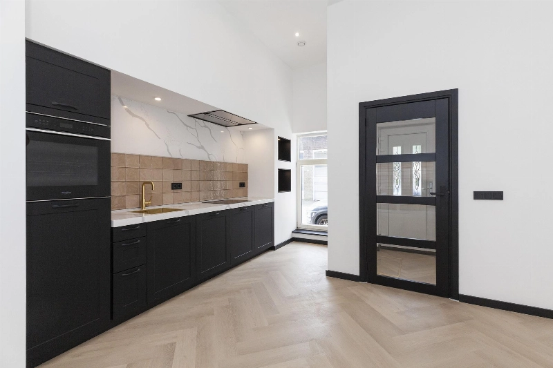 De royale leefruimte is afgewerkt met glad gestucte wanden en een stijlvolle visgraat PVC-vloer. Via de schuifpui bereikt u de zonnige patio – een heerlijke buitenplek met veel privacy. De moderne open keuken is een ware eyecatcher, uitgevoerd met zwarte fronten, een marmeren werkblad én achterwand. De goudkleurige kraan en spoelbak maken het plaatje compleet. Uiteraard is de keuken volledig uitgerust met hoogwaardige inbouwapparatuur, waaronder een inductiekookplaat, vaatwasser en combimagnetron.