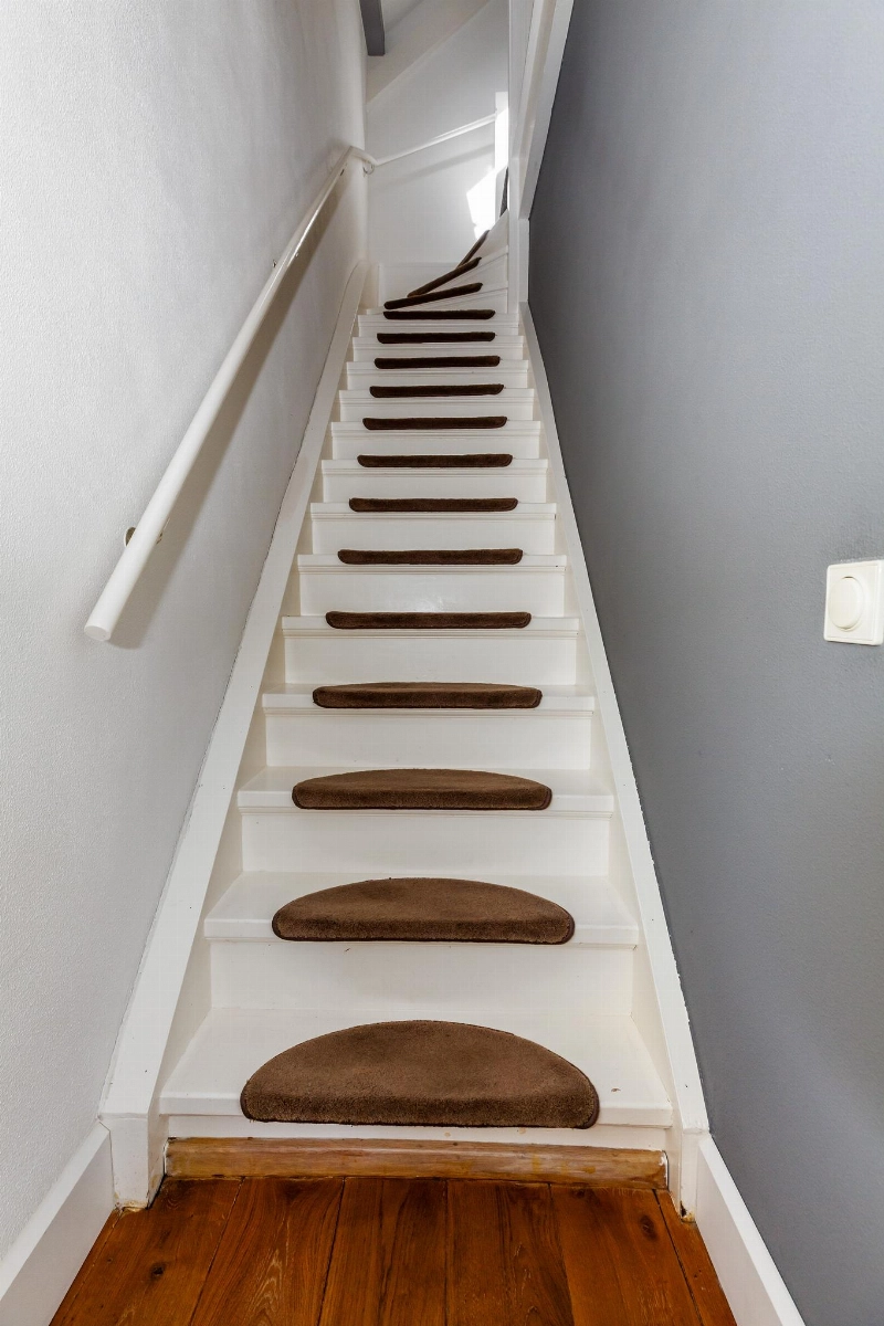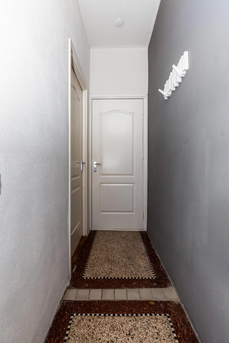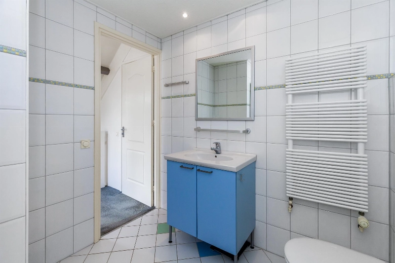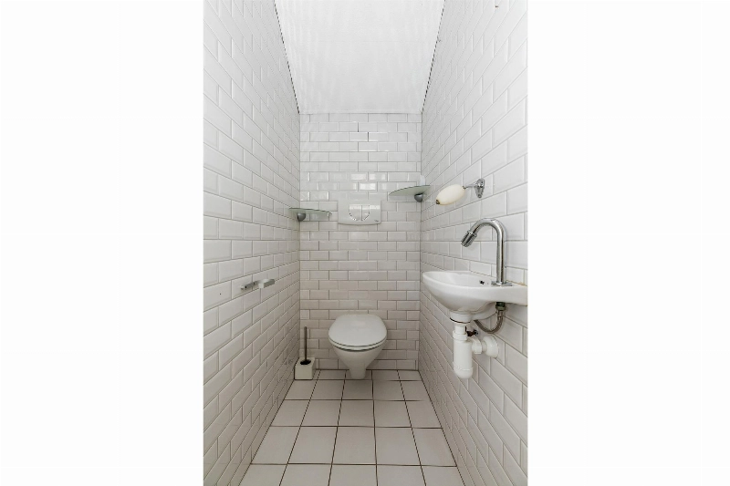 Entree via de hal met authentieke granitovloer, meterkast en een fraai glas in lood raam boven de voordeur. Het toilet is ruim en stijlvol afgewerkt met witte metrotegels op de wand, witte vloertegels, een zwevend toilet en een fonteintje.
