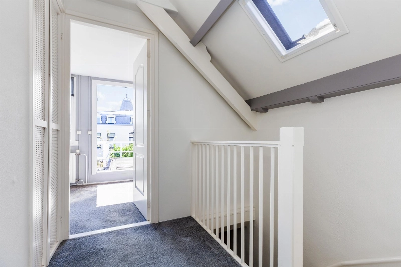 Ruime en speelse overloop met een daklicht dat voor extra daglicht zorgt.