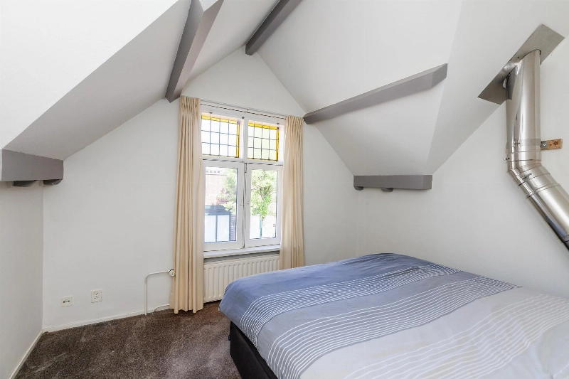 Slaapkamer I is gelegen aan de voorzijde van de woning en heeft een grote inloopkast en ook hier hebben we sfeervolle glas in loodramen.