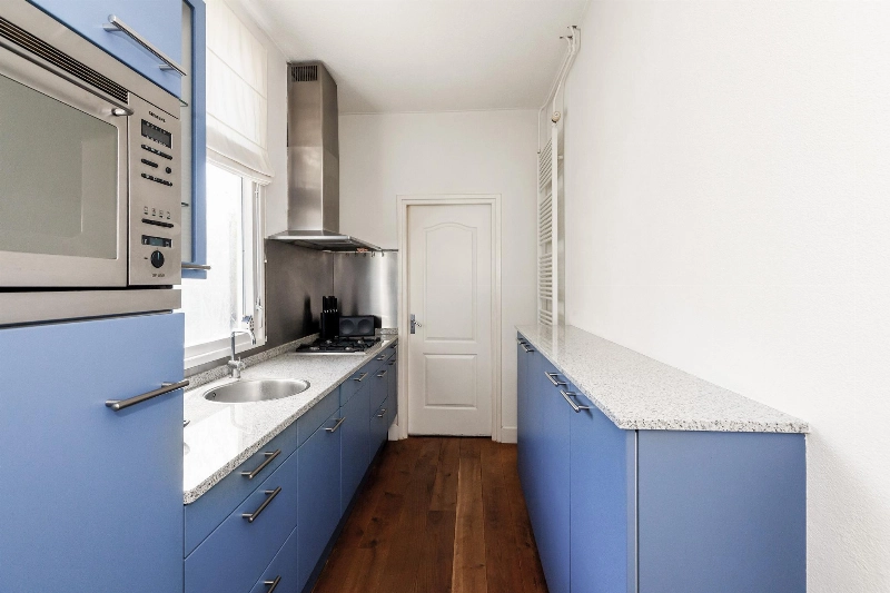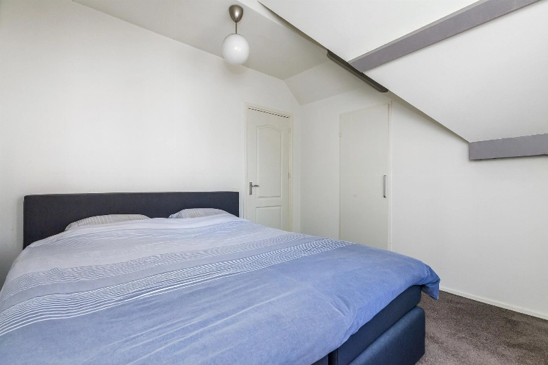 Slaapkamer II ligt aan de achterzijde en heeft eveneens een grote inloopkast en directe toegang tot het zonnige dakterras. Zowel de deur als het raam is voorzien van een rolluik.